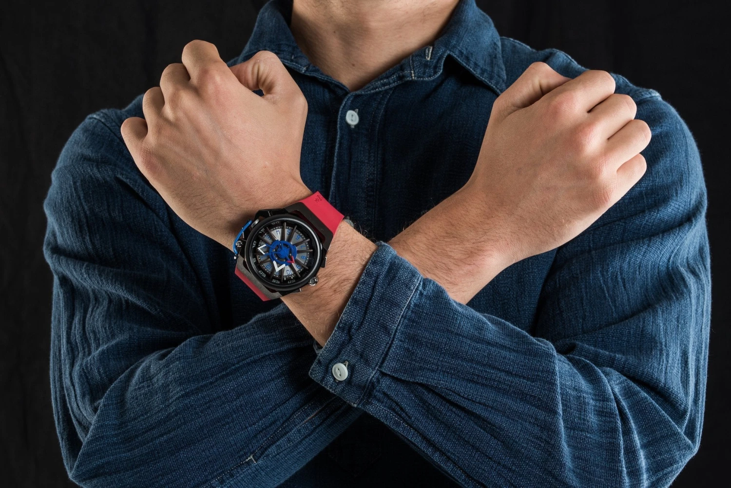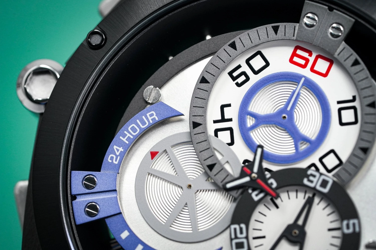 The ‘Reverse’ system allows the case to be inverted fully in both directions. A quick-release catch releases the crown from its protection by rotating the crown protector. Two special arms allow the case to rotate freely, and a clearly recognisable click tells you when the case is in the correct position to be locked back into place. A simple manoeuvre that transforms RIM into an elegant and sporty chronograph watch.