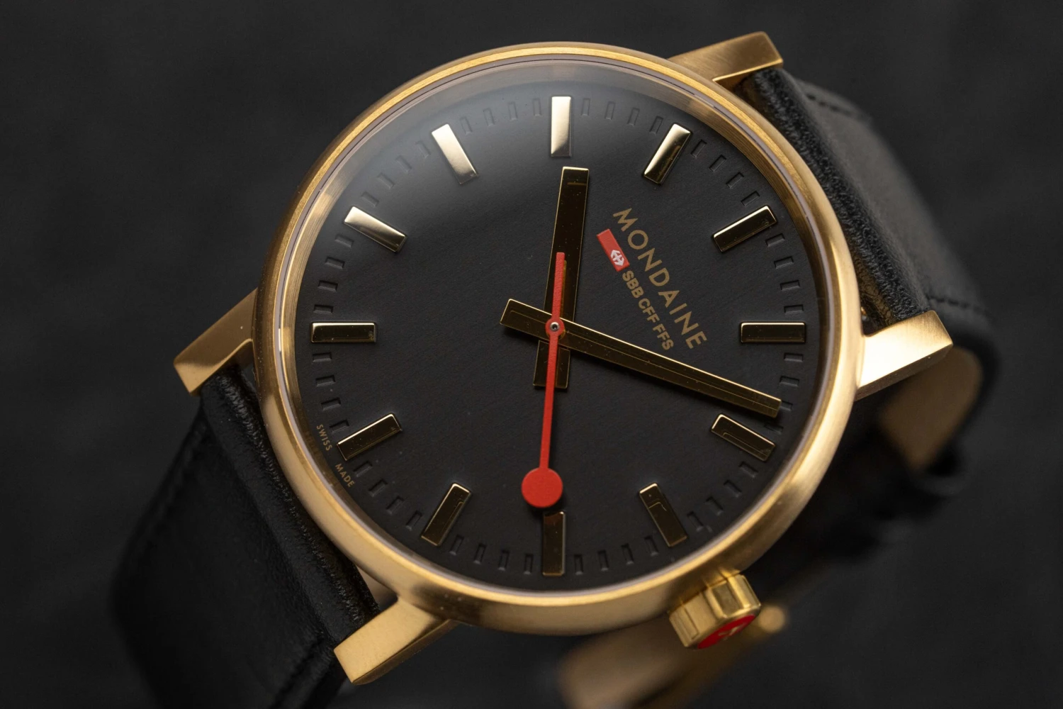 Black Dial – Gold Hour and Minute Hands – Red Second Hand – Hour Indexes.