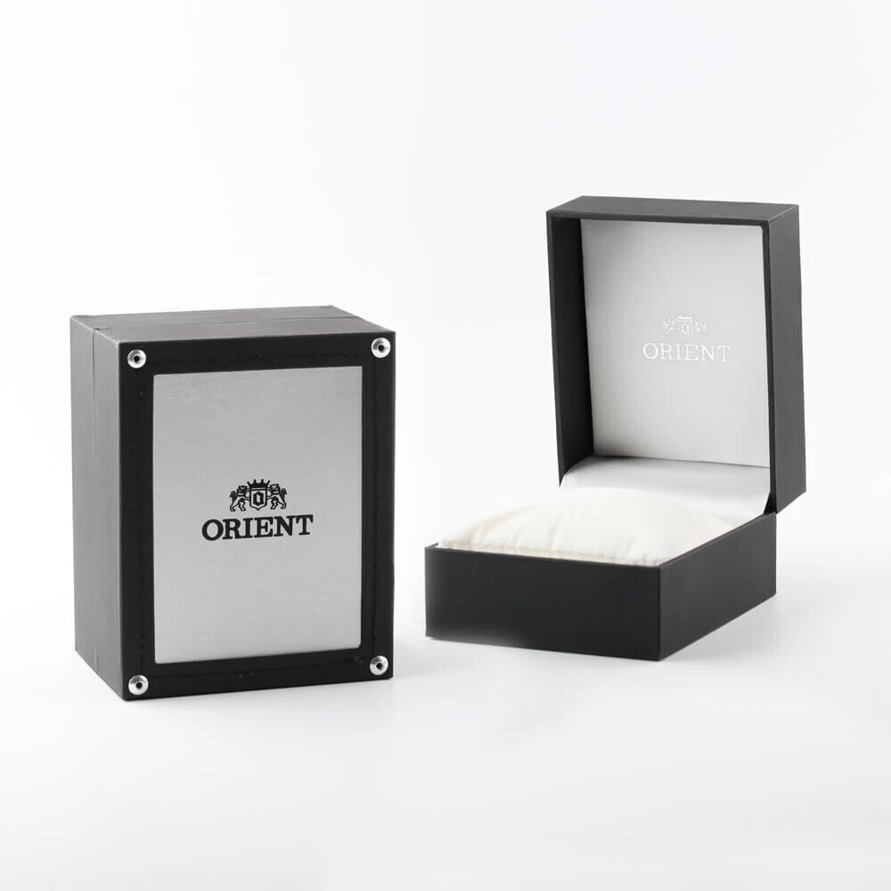 The elegant AC00007W features a sophisticated 40.5mm ORIENT mechanical watch with a stainless steel gold case, white dial, and crocodile textured leather band. It also includes stylish gold hands, roman numeral hour markers, a date aperture, a chapter ring, and a hand-wound crown with automatic self-winding functionality. This classic timepiece offers water resistance up to 30 meters.