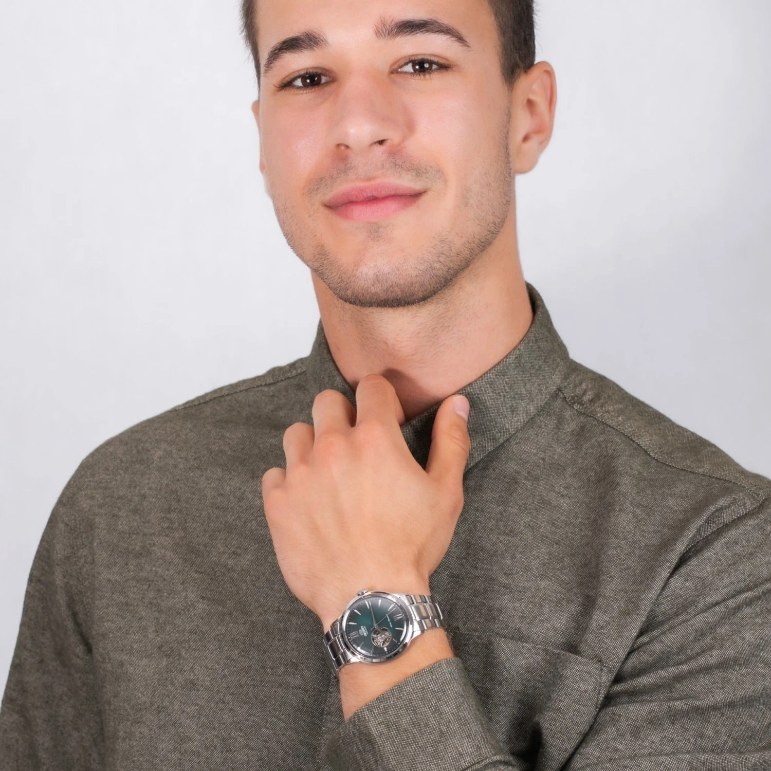 The dial is a striking green, adding a modern touch to its classic aesthetic. Protected by toughened mineral glass, the dial remains well-guarded against scratches and damage. The polished silver hands and hour markers further enhance the watch’s elegant appearance. Powered by the in-house Seiko Instruments Inc. F6T22 automatic movement, the watch offers reliable timekeeping with 22 jewels, a 40-hour power reserve, and hacking functionality for precise adjustments.