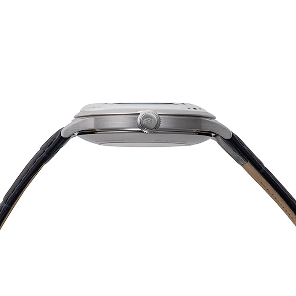 The blue dial is accentuated with silver-tone dauphine hands and matching silver baton hour markers, creating a clean and sophisticated look. A mineral crystal protects the dial, providing durability and clarity. The exhibition caseback allows the wearer to appreciate the intricate mechanics of the watch.
