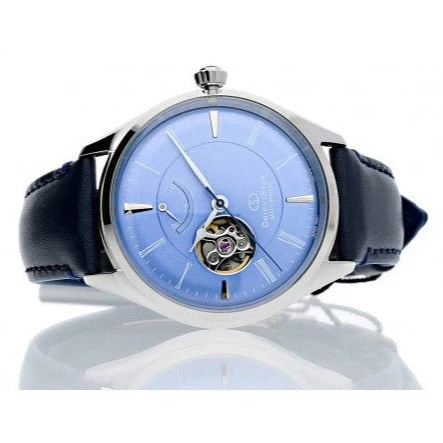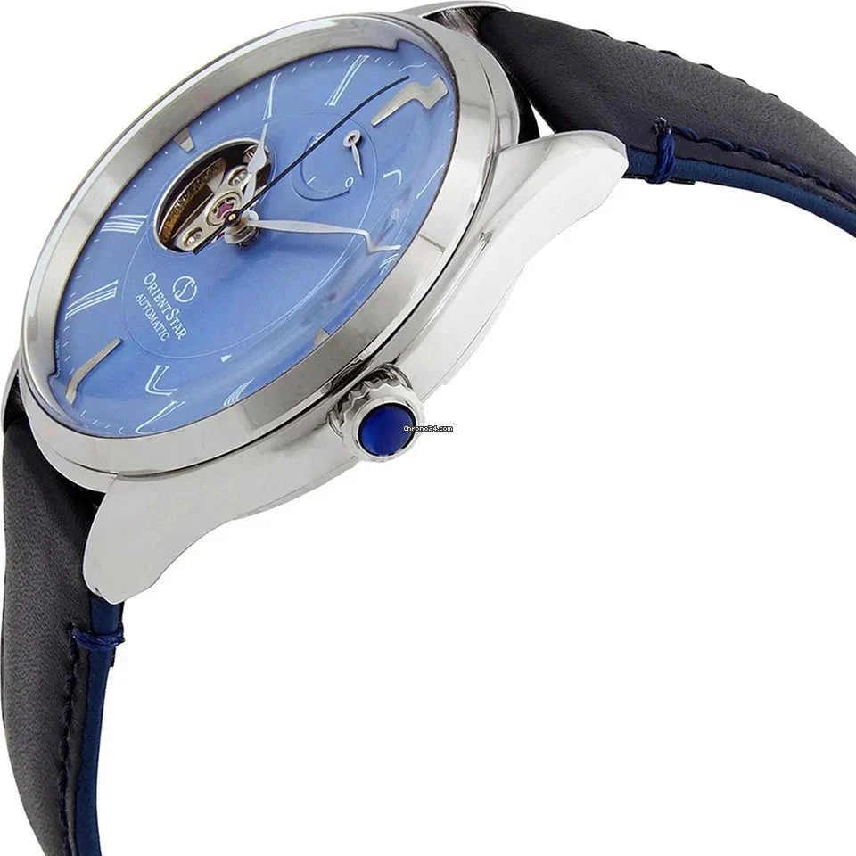 The ORIENT STAR Mechanical Classic watch is an exquisite timepiece designed for everyday elegance and function. This 40.4mm semi-skeleton watch is inspired by natural colours and the gentle light of the sun, reflected in the deep blue dial. The dial features delicate Roman numerals, spade-shaped hands, and stylish embossed index markers, all protected by a gently domed crystal glass, enhancing its refined profile. The crown is accented with a rhinestone, adding a subtle touch of sophistication.