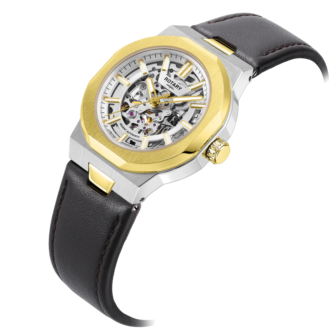 Discover the pinnacle of Rotary watches with the Skeleton, their latest model that elevates the classic design. It features a striking black stepped flange that highlights the intricate movement, complemented by a beautifully integrated leather strap. With a 40mm two-tone gold PVD stainless steel case, sapphire crystal, and 100m water resistance, this watch embodies Rotary’s commitment to elegance and artistry. Embrace the evolution of the Skeleton.