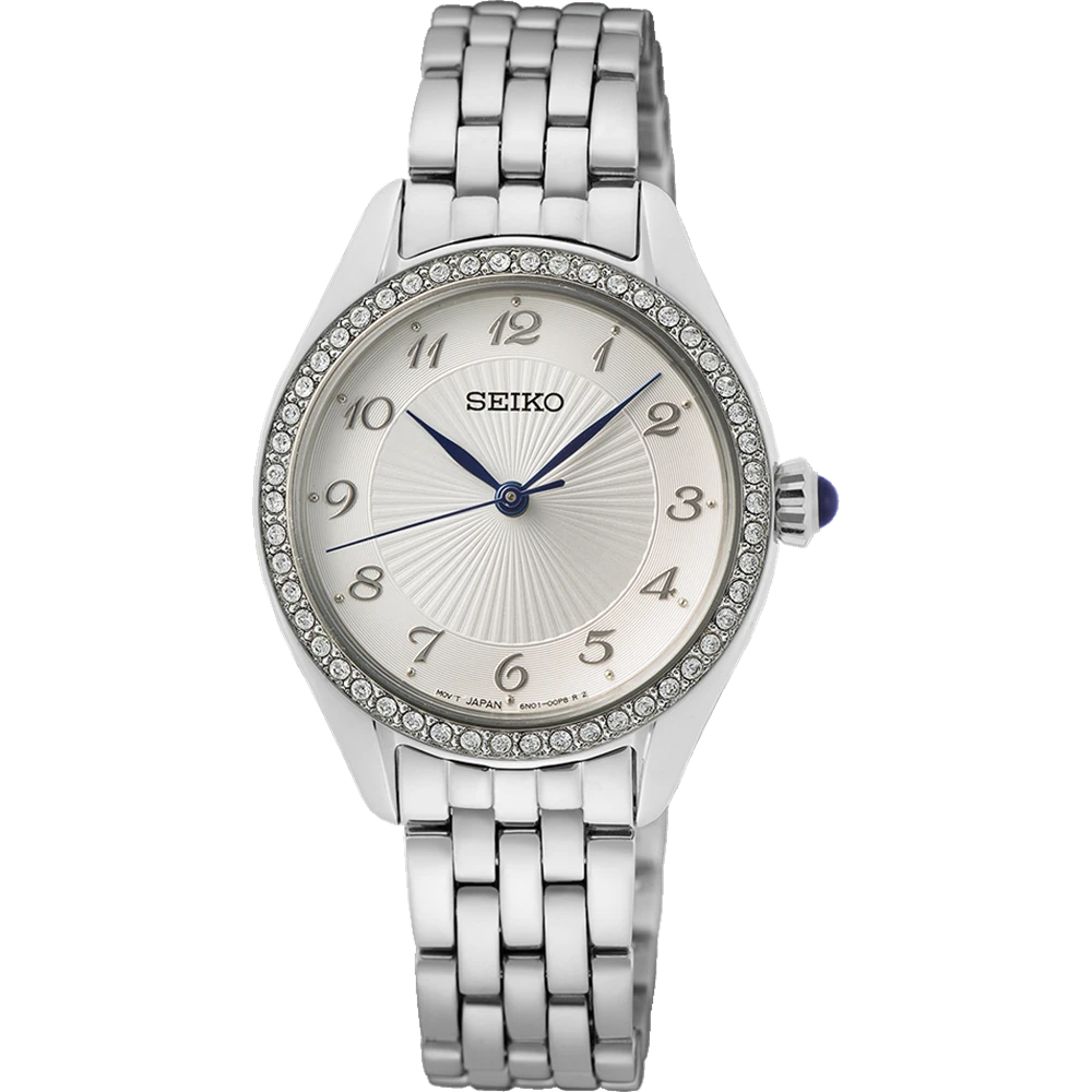 The Seiko Daywear Ladies Silver Watch (SUR479P) is an elegant and versatile timepiece perfect for everyday wear and special occasions. This classic watch features a white dial encased in a stainless steel case adorned with 50 sparkling crystals, adding a touch of glamour to its sophisticated design. The silver stainless steel bracelet ensures a secure and comfortable fit, making it an essential addition to any watch collection.