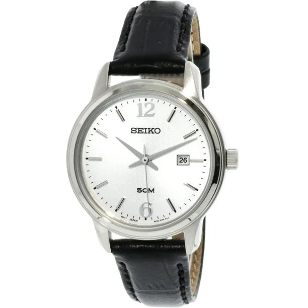 The Seiko Neo Classic Quartz Women’s White/Silver Watch (SUR659) combines timeless elegance with modern functionality. This sophisticated timepiece features a 30mm stainless steel case paired with a comfortable leather strap, providing a perfect balance of style and comfort. The white and silver dial is protected by a Hardlex crystal and showcases index markers with numbers at the 12 and 6 o’clock positions for easy readability.