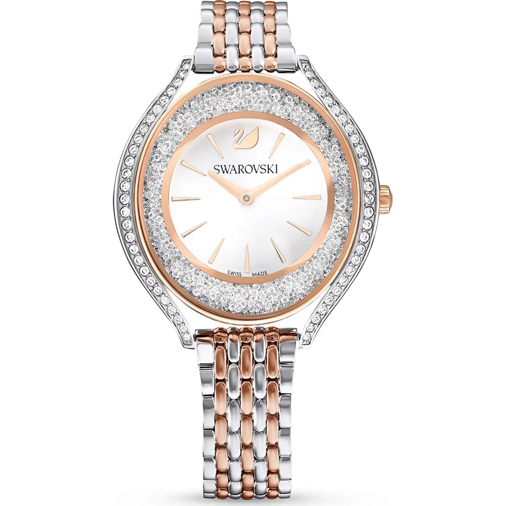 Elevate your style with the exquisite Swarovski Crystalline Aura Quartz Two-Tone Rose Gold-Tone Watch, a stunning timepiece designed for the modern woman who values both elegance and precision. Crafted in Switzerland, this watch combines Swarovski’s signature crystal craftsmanship with practical functionality. The 35.5mm case is adorned with over 1,300 meticulously placed crystals, creating a dazzling effect that catches the light with every movement. The Swarovski swan at the 12 o’clock position adds a graceful touch, symbolizing the brand’s commitment to luxury and design excellence.