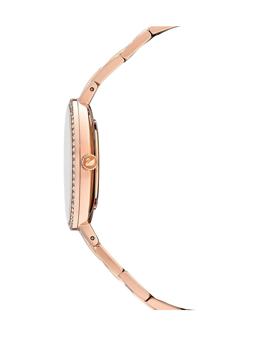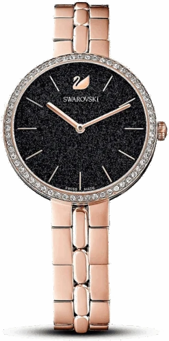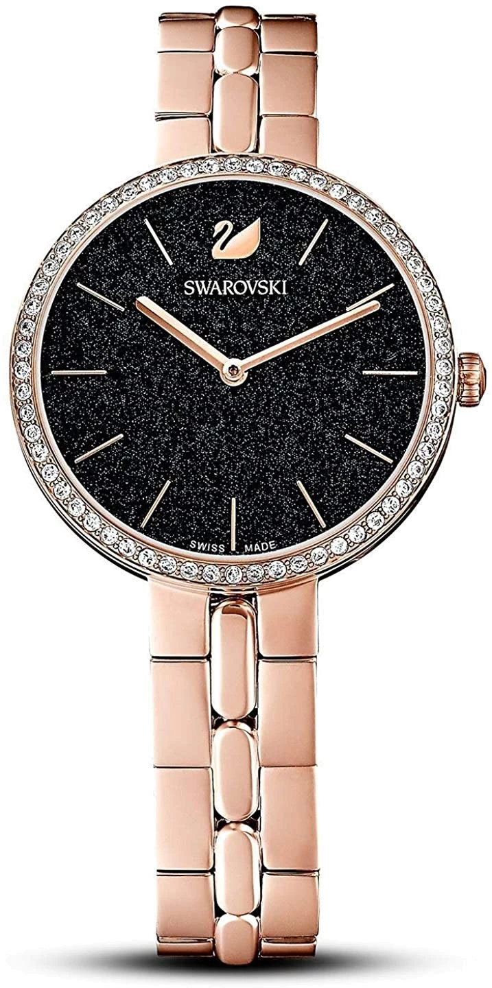 Black Crystal Dial – Polished Rose Gold PVD Stainless Steel Hour and Minute Hands – Swarovski Logo at 12 O’Clock.