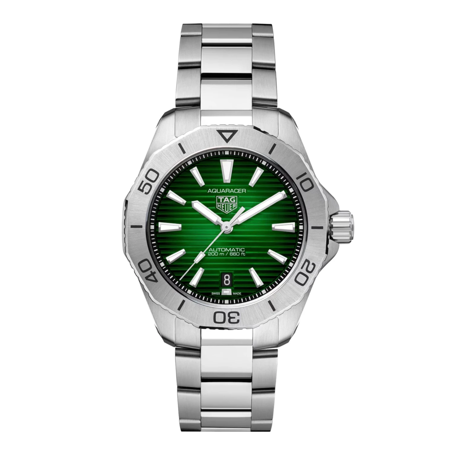 The Tag Heuer Aquaracer Professional 200 Date Automatic Green Watch combines robust design with striking style, perfect for outdoor adventurers. Its 40mm steel case, fine-brushed and polished, pairs with a deep-green sunray brushed dial that evokes the intensity of a rainforest. Ultra-legible hands and markers, coated with white Super-LumiNova®, ensure clarity even in low light.