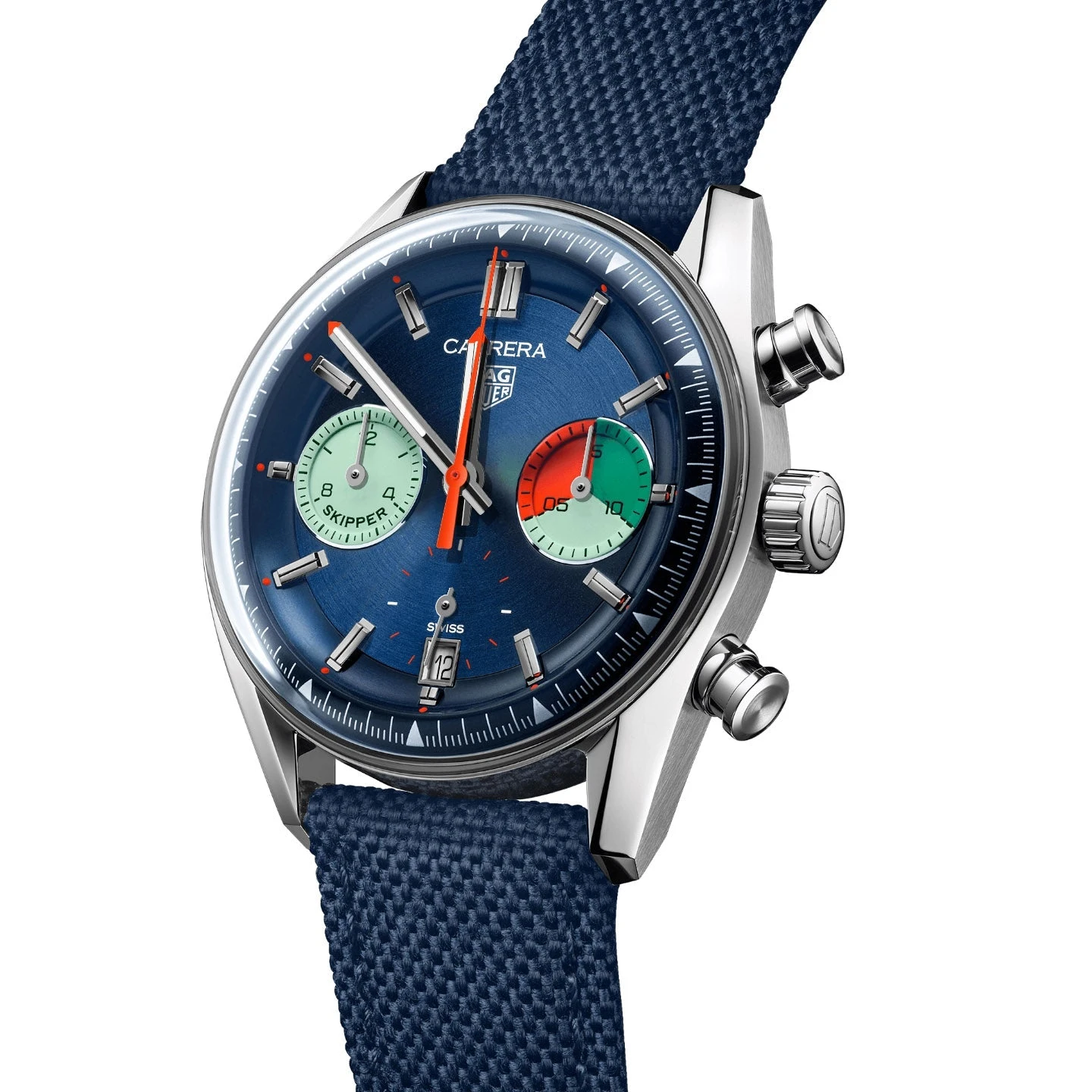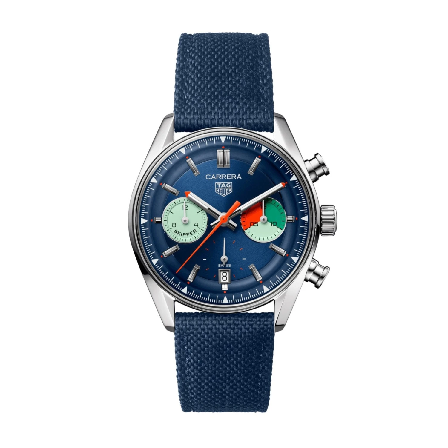 The Tag Heuer Carrera Men’s Blue Chronograph Skipper Watch pays homage to TAG Heuer’s rich sailing heritage. Its striking 39mm steel case features a fine-brushed and polished finish, embodying a seamless fusion of classic craftsmanship and precision. The dual-counter dial showcases a daring combination of teal, orange, green, and blue, reminiscent of maritime adventures.