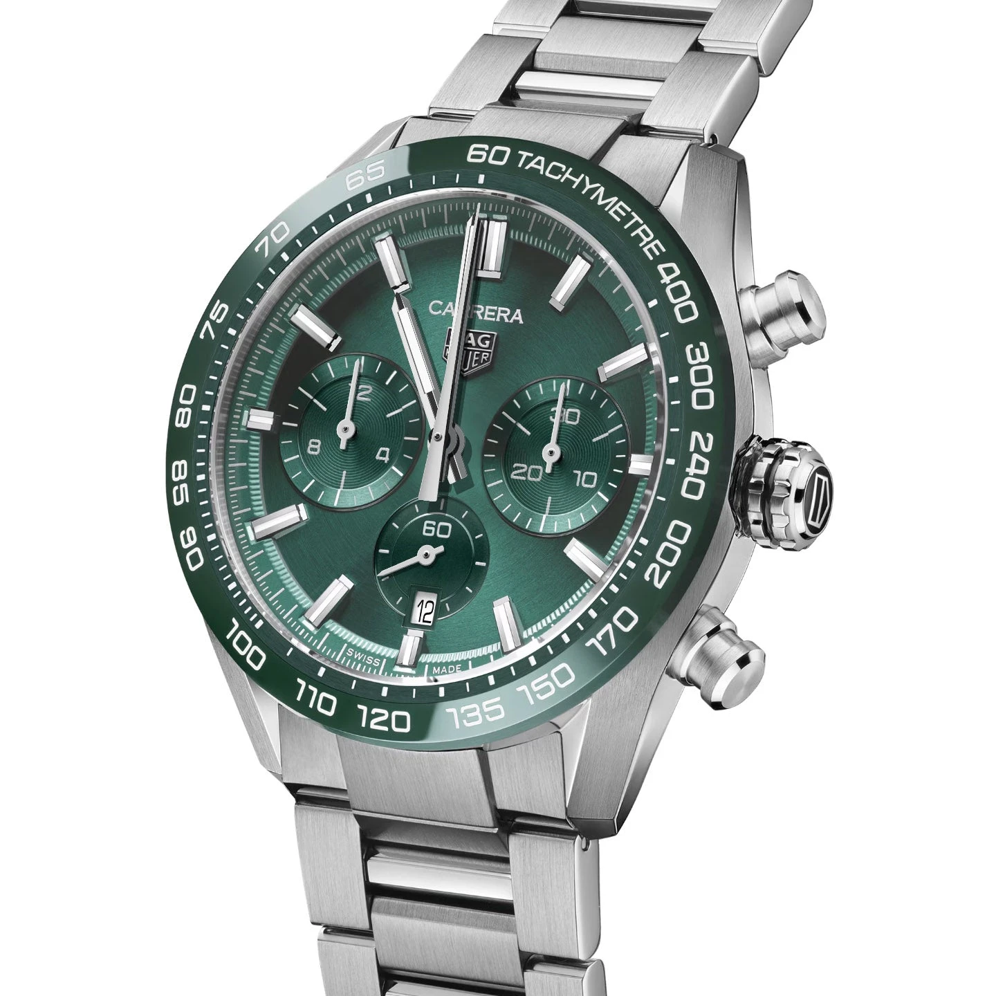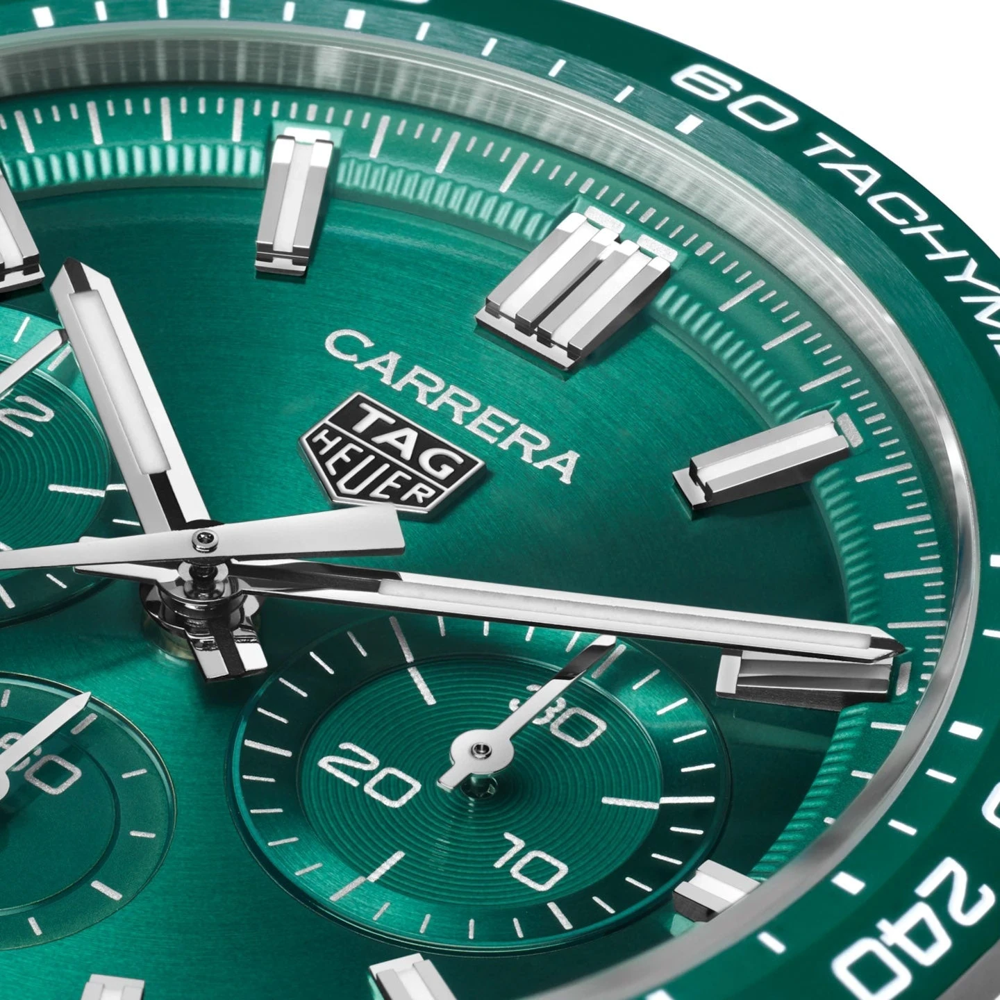 The Tag Heuer Carrera Men’s Green Chronograph Watch CBN2A1N.BA0643 takes a bold step into adventure with its intense green circular brushed dial and matching ceramic tachymeter bezel. This dynamic and stylish 44mm timepiece combines a classic chronograph design with modern flair, making it perfect for those who thrive on challenges. The rhodium-plated hands and applied indexes stand out against the green dial, ensuring clear legibility.