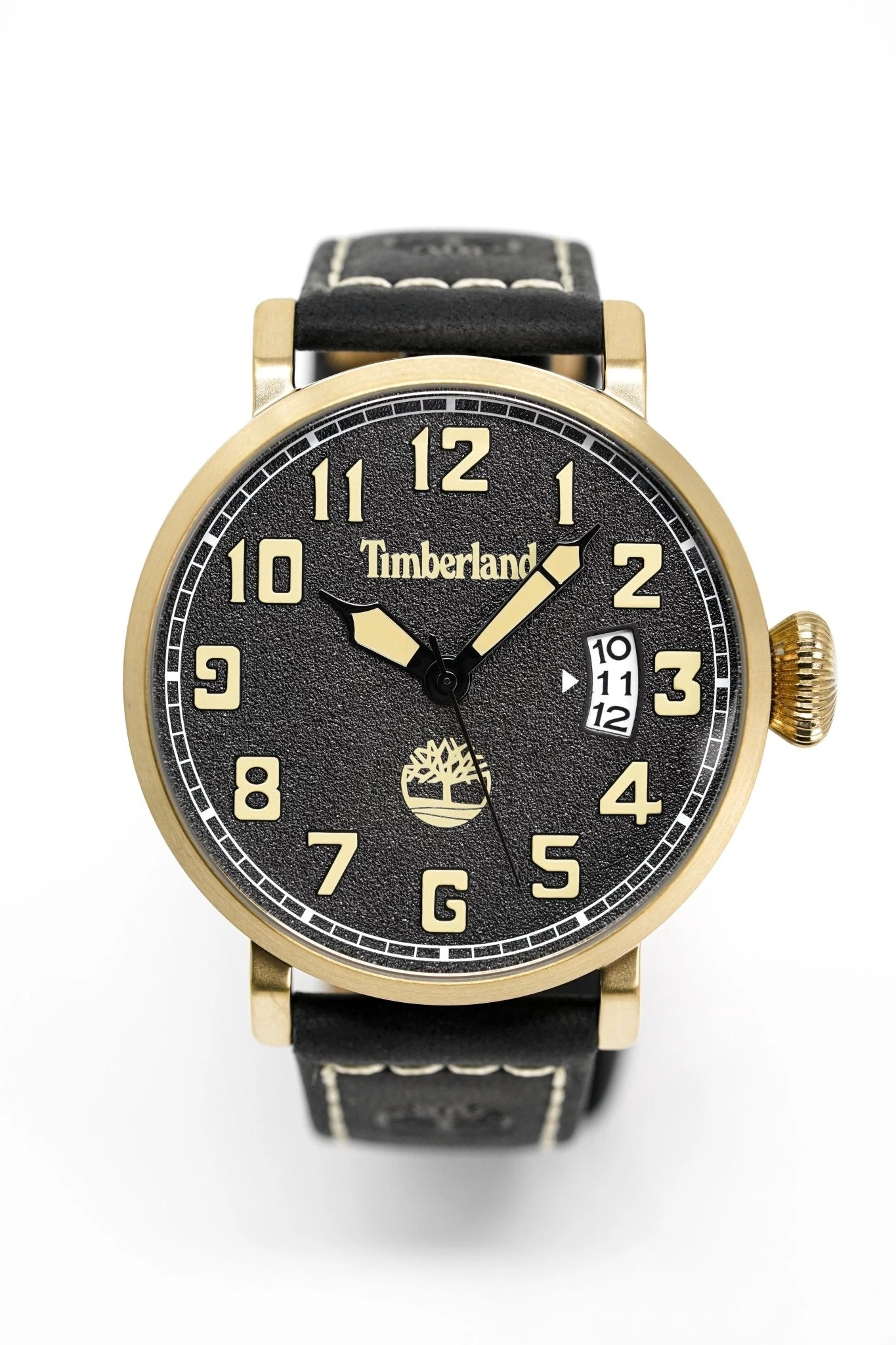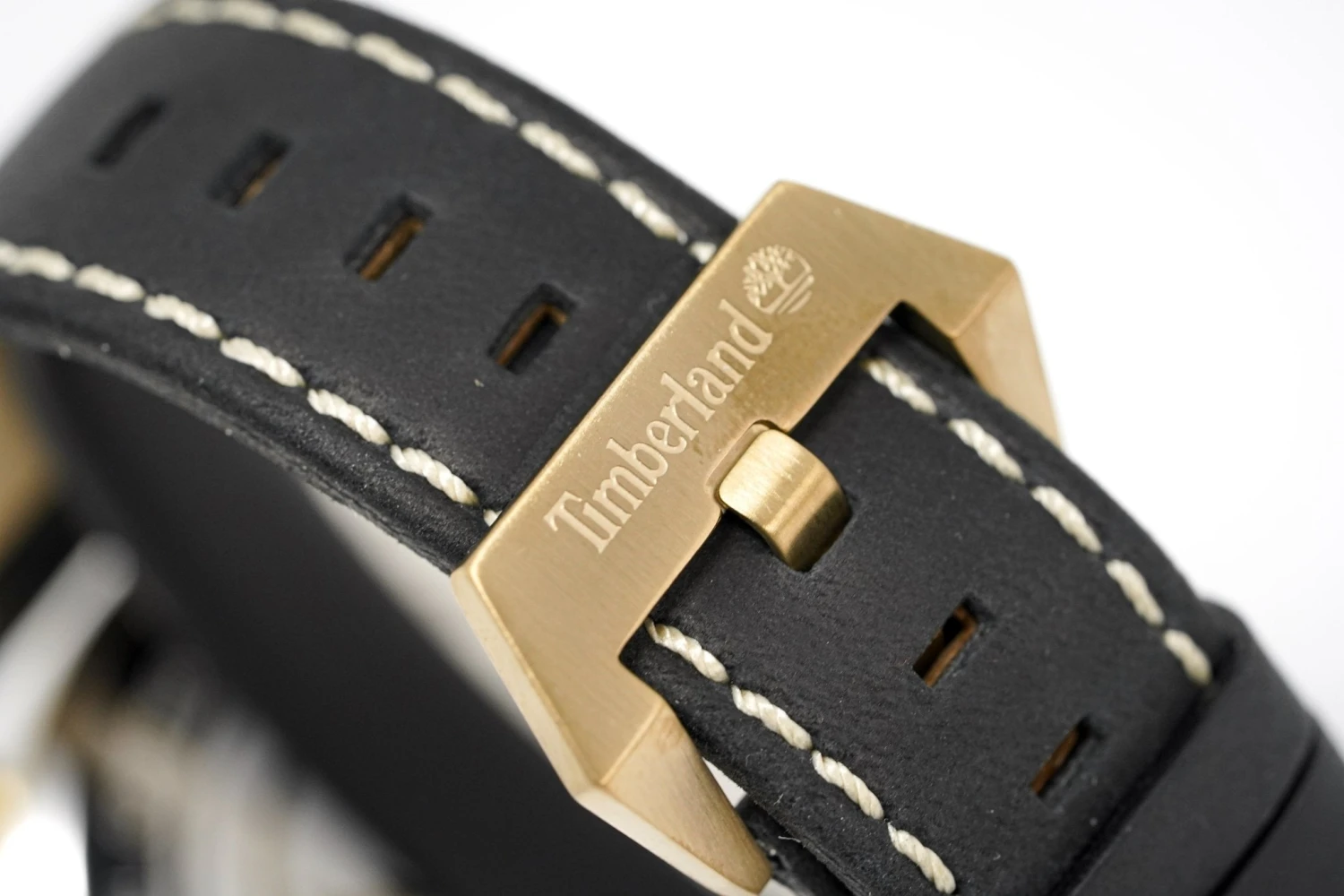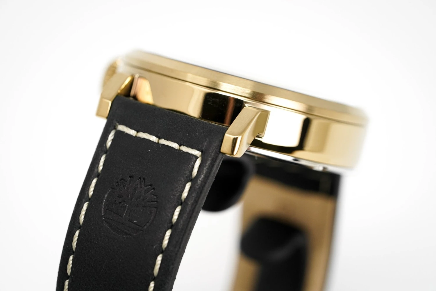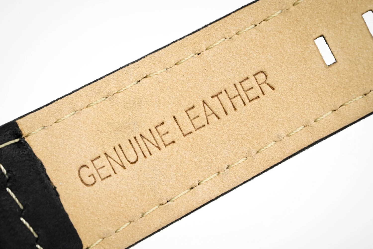 24mm Black Leather Strap With White Stitching. Gold Plated Pin Buckle.