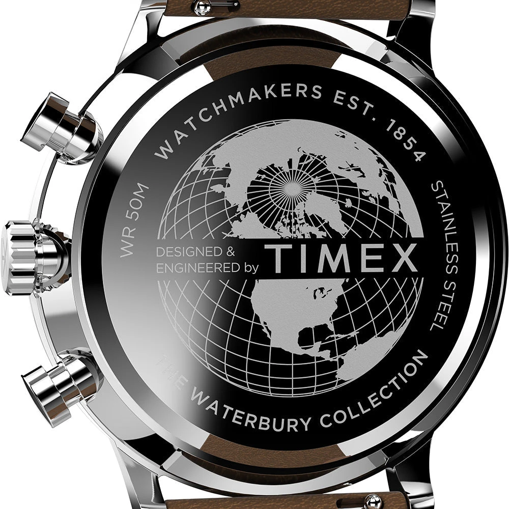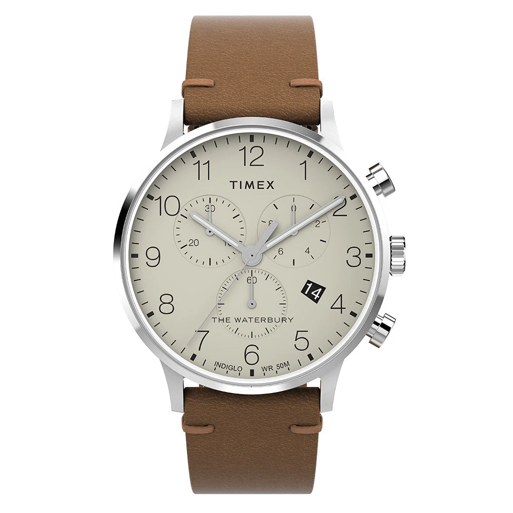 We’ve looked to our past, and we’re paying homage to our original watch collection. This chronograph displays our attention to craftsmanship and detail with finely finished surfaces and careful applications of watchmaking ingenuity. Featuring a stainless-steel case, cream dial with dimensional Arabic numerals, date window at the 4 o’clock marker, INDIGLO® backlight, and a tan natural leather strap sourced from the Leather Working Group® (LWG), our Waterbury Classic Chronograph unites all these elements into something that delivers function just as well as form.Â