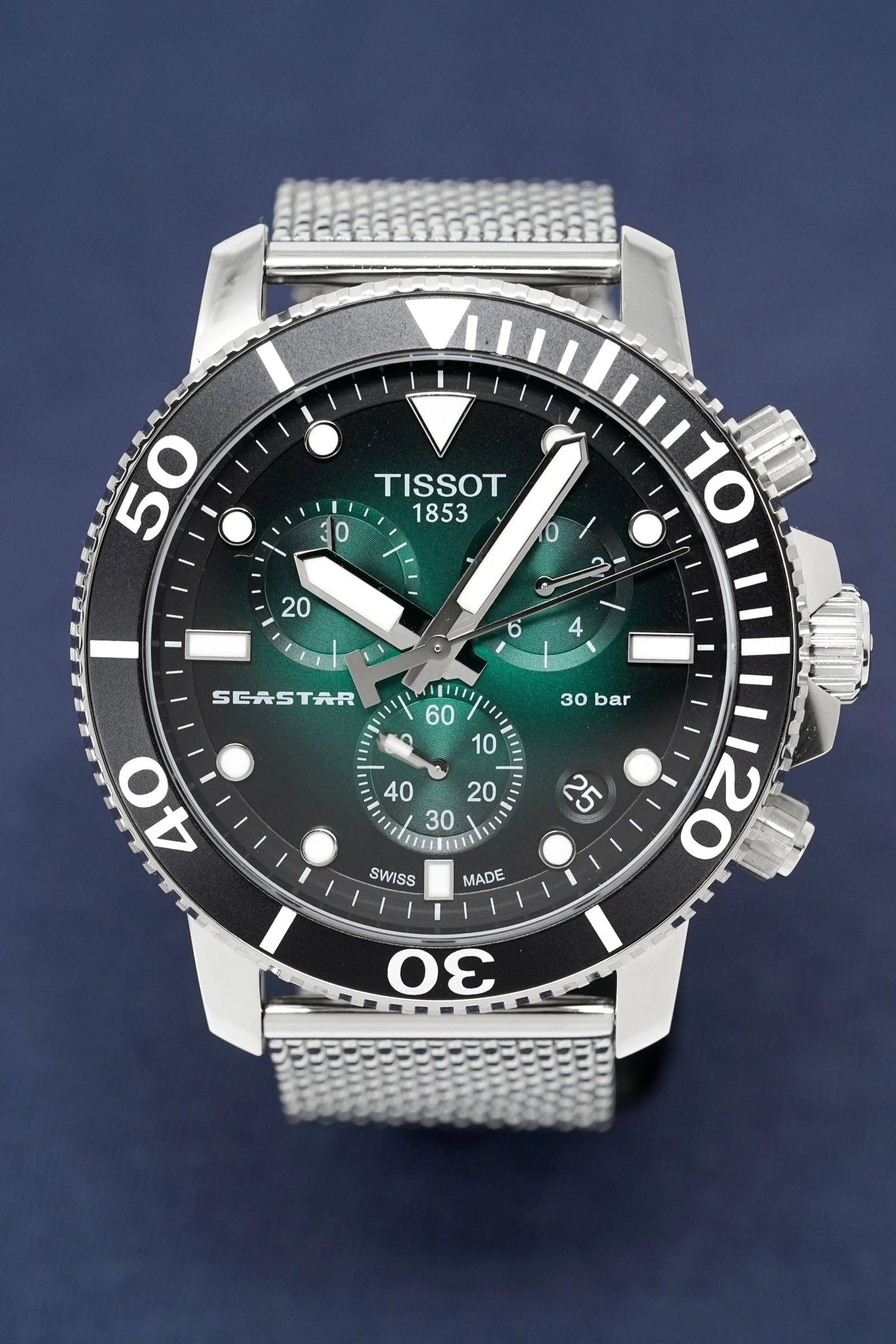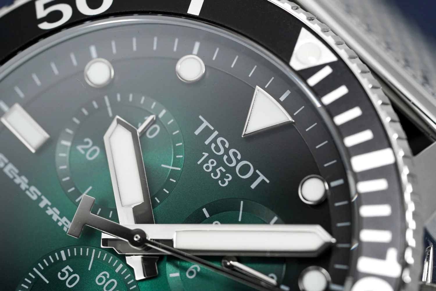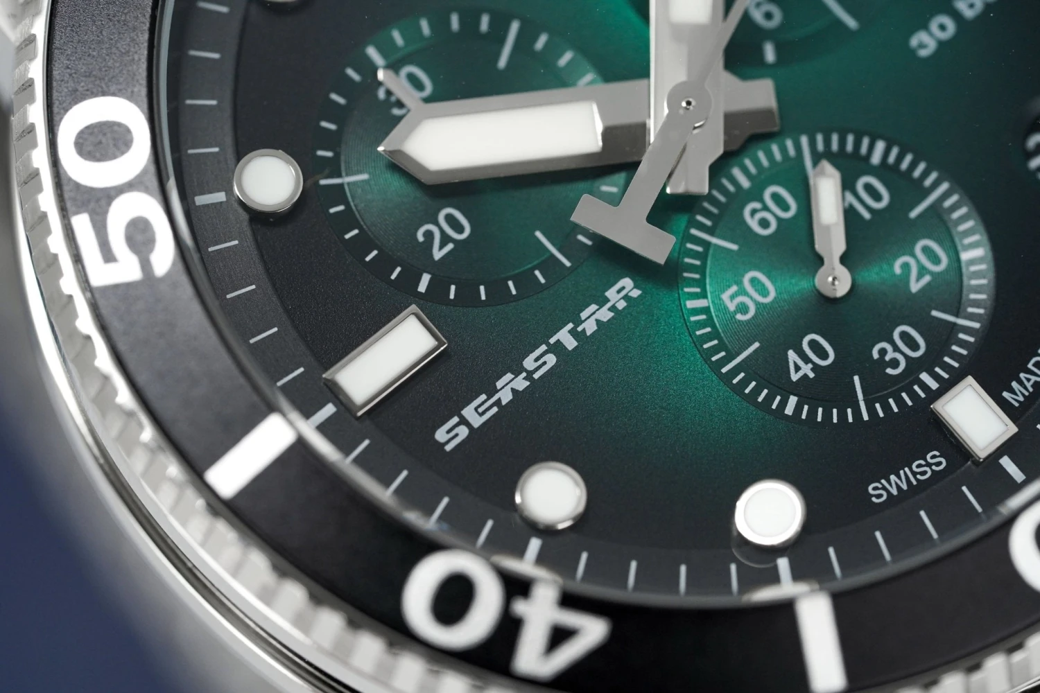 Green/Black Graded Dial with Stainless Steel Luminous Hands and Indexes – Small Seconds – Date Window Between 4 and 5 O’Clock – 1/10 Seconds, 60 Seconds and 30 Minutes Sub-Dials –Â ADD and SPLIT Functions.