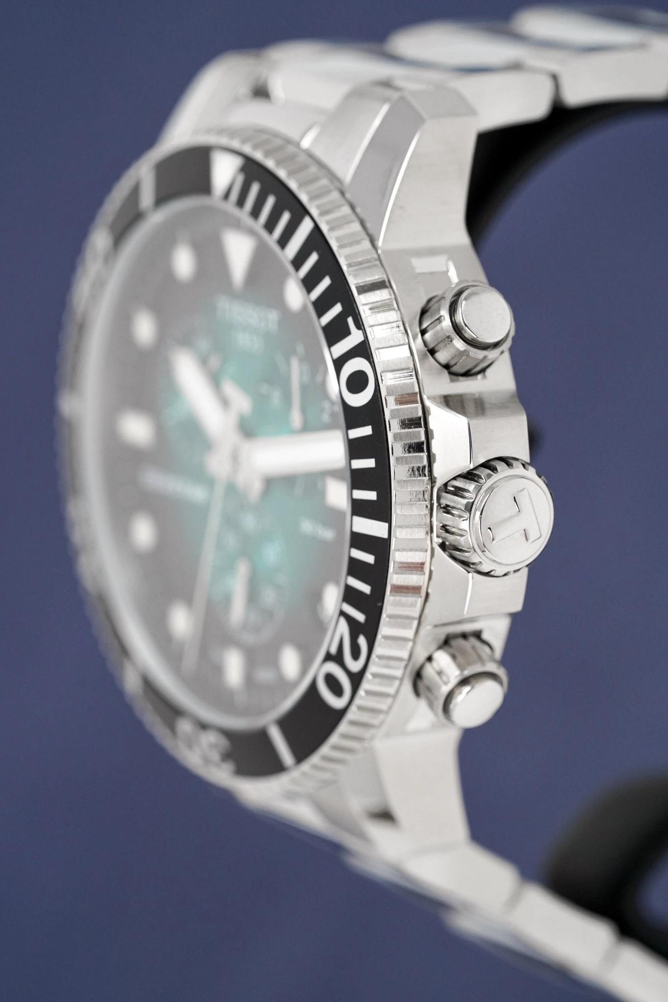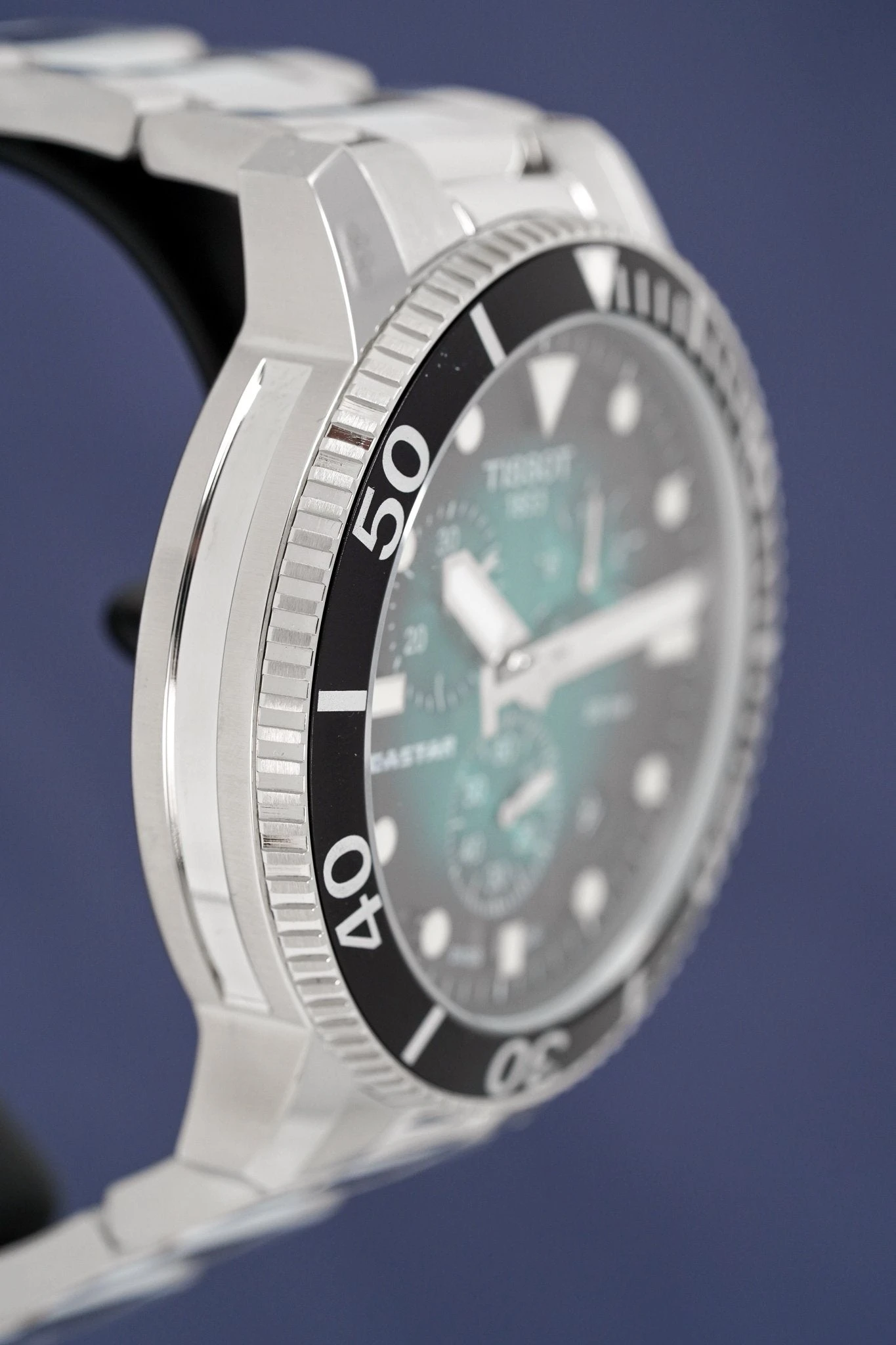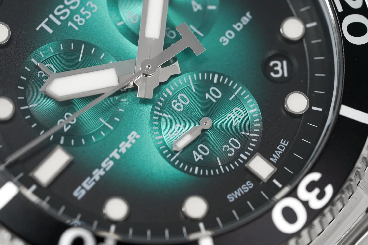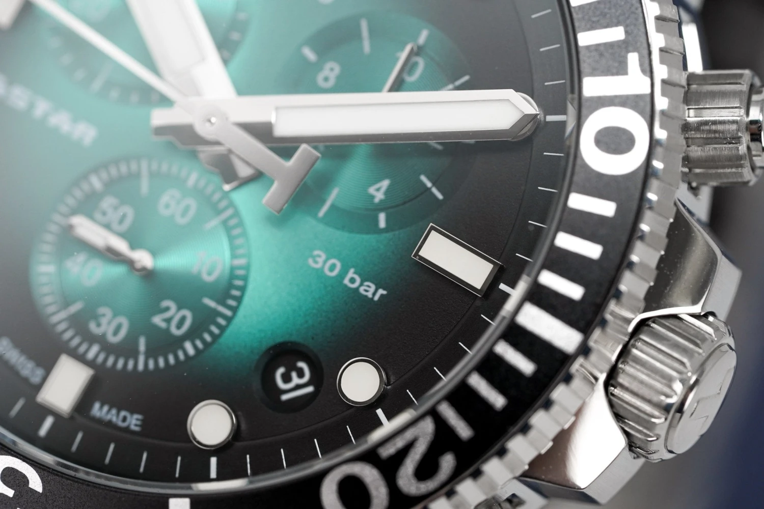 Green/Black Graded Dial with Stainless Steel Luminous Hands and Indexes – Small Seconds – Date Window Between 4 and 5 O’Clock – 1/10 Seconds, 60 Seconds and 30 Minutes Sub-Dials –Â ADD and SPLIT Functions.