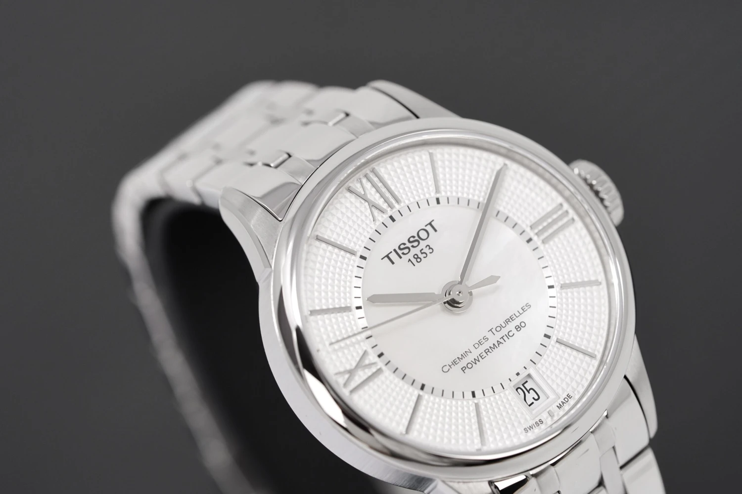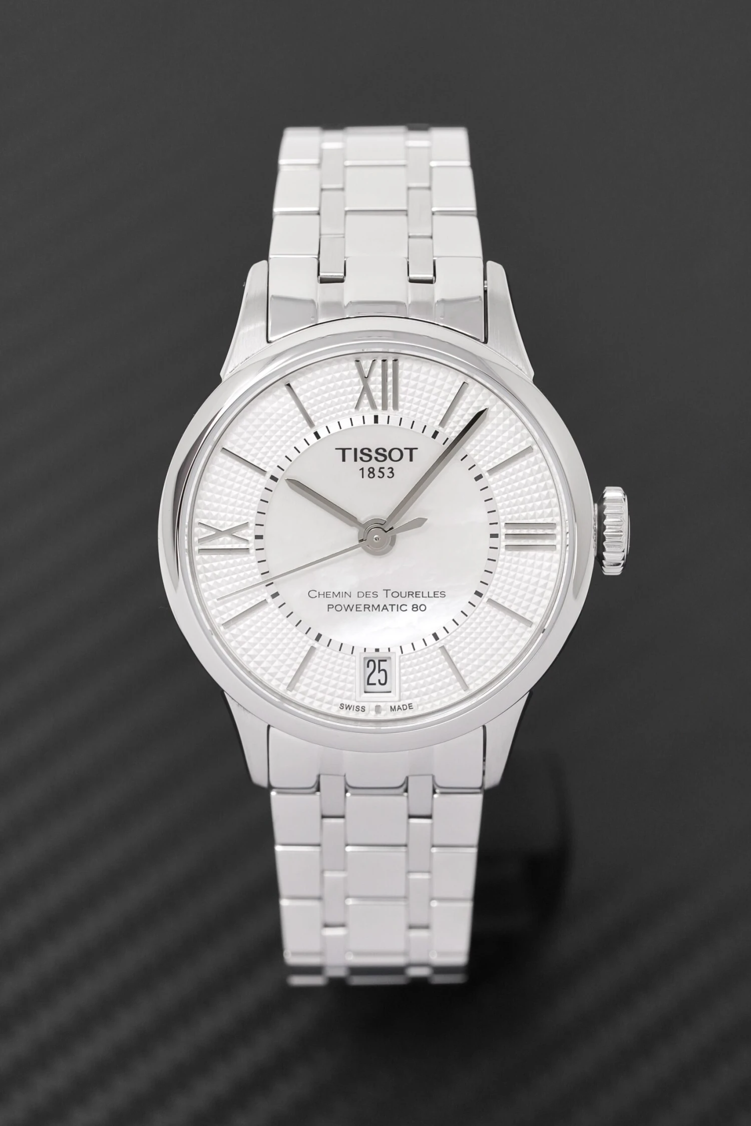 Mother of Pearl Guillochè Sector Dial. Applied Steel Roman Numeral Indexes. Stainless Steel Hands. Date Window at 6 O’Clock.