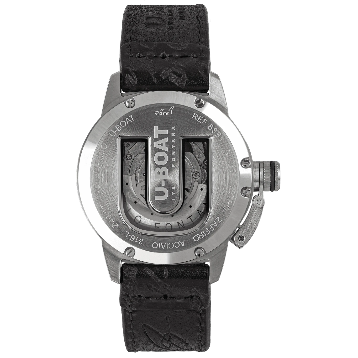 - Movement: Swiss automatic winding with U-BOAT technical specifications. Frequency: 28,800 vibrations/hour. Power reserve: 44 hours. 26 rubies. Custom skeletonized rotor.