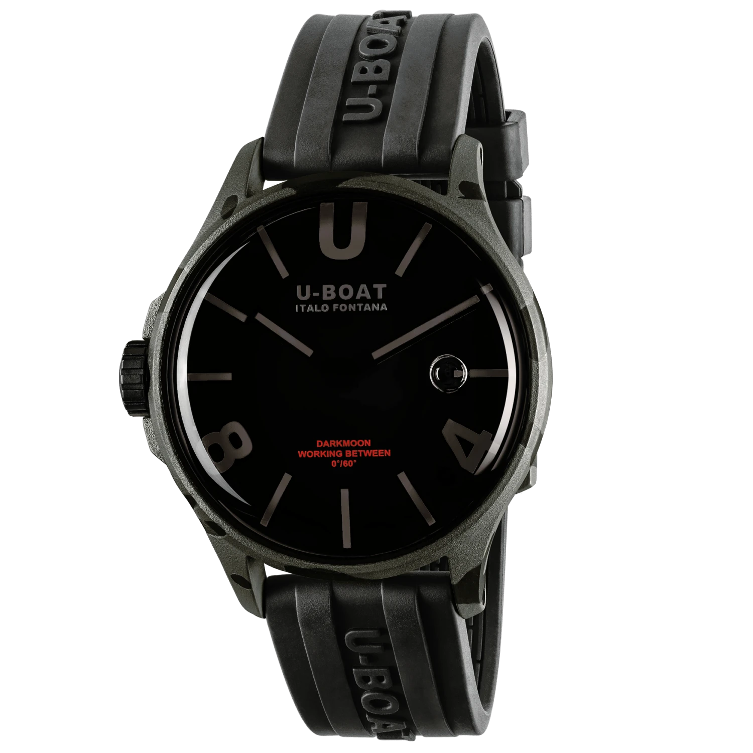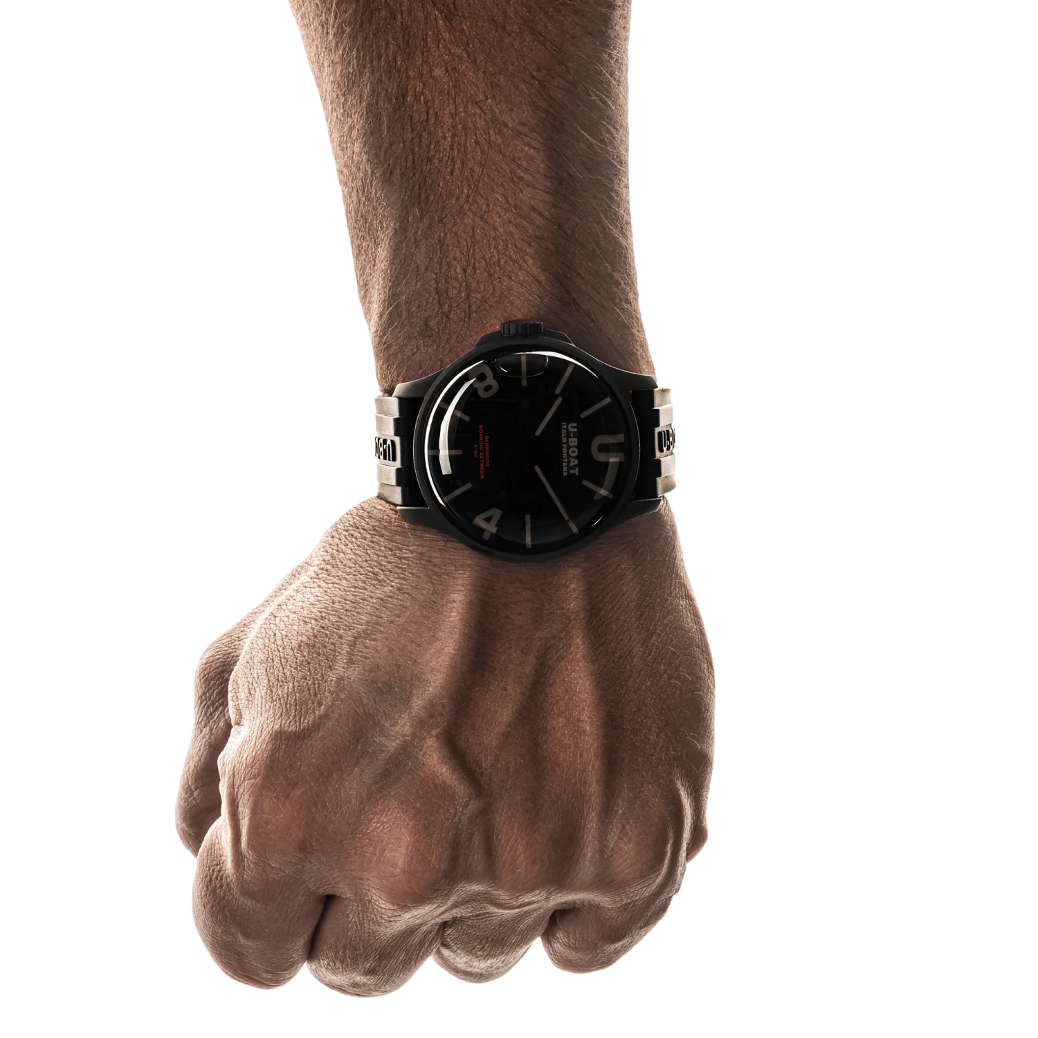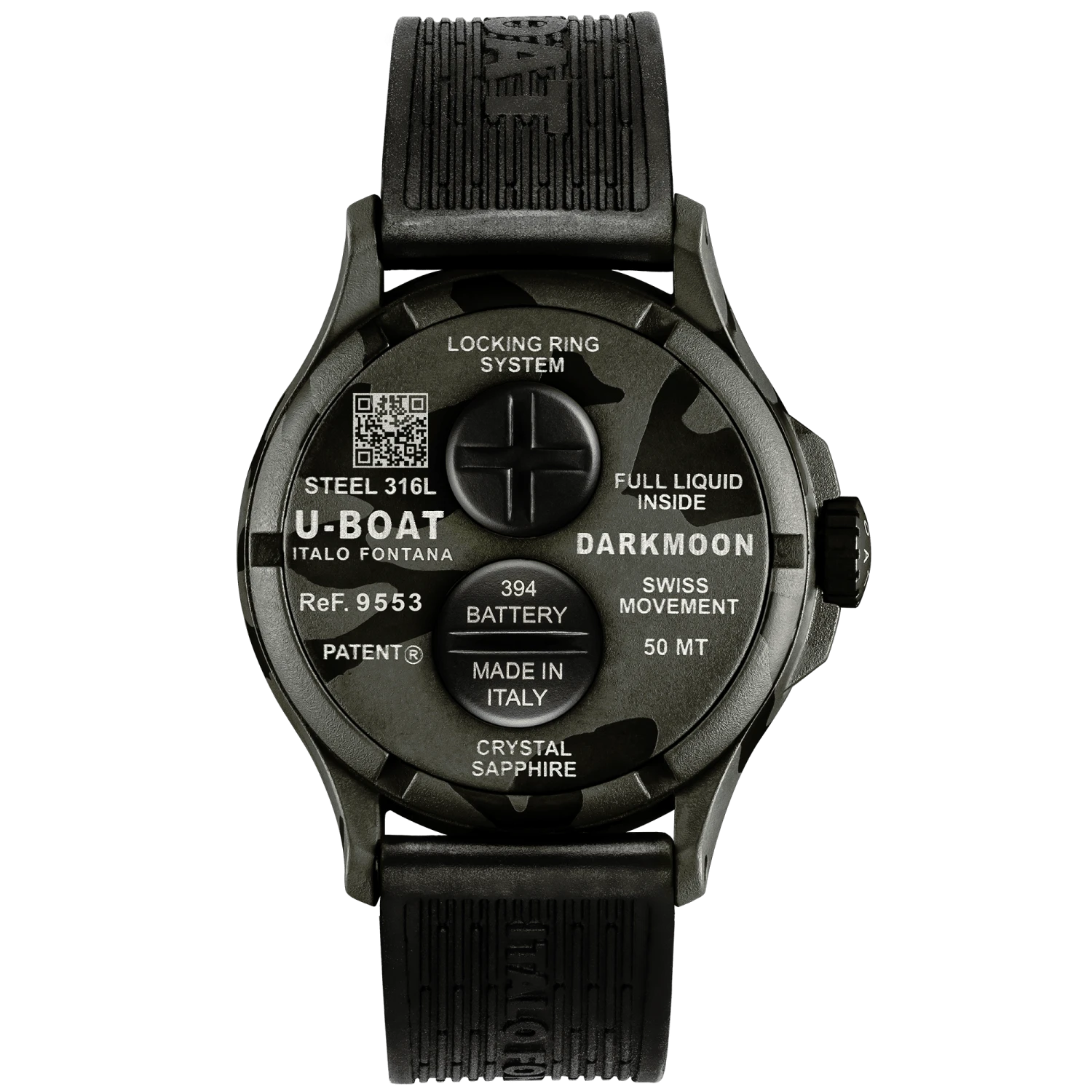 made of AISI 316L steel with camouflage treatment, completely filled with a special oil that enhances the dial, creating the illusion of the absence of glass, with a deeper colour effect and improved readability. Visible air bubble on the dial to compensate for temperature variations. Protective crown guard on the left. 44.8 mm diameter.