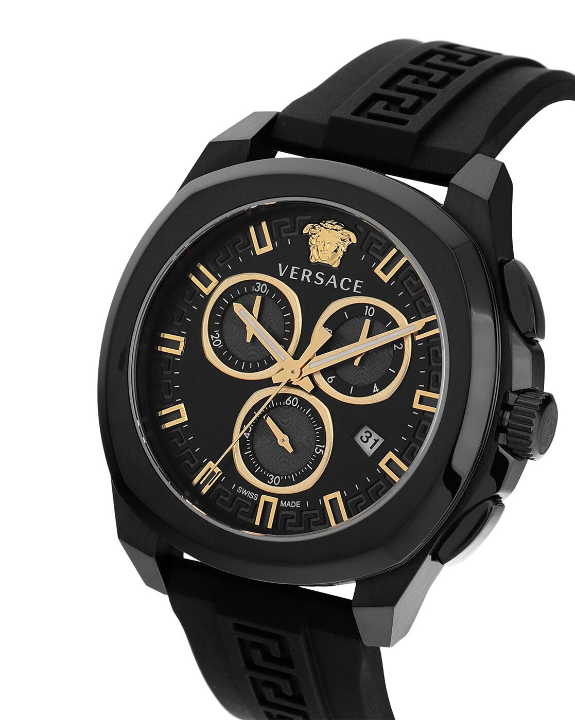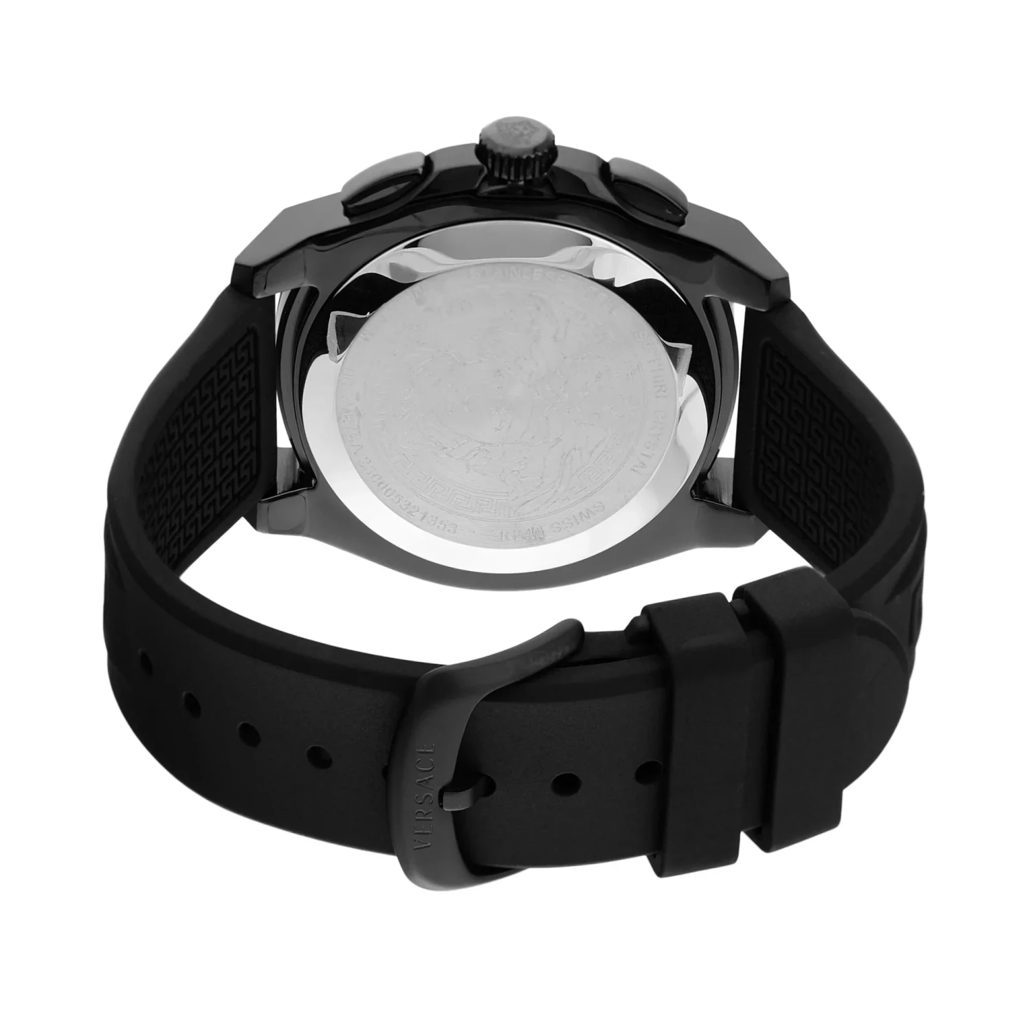 Fitted with a sturdy black rubber strap and a 22mm width, the Versace Geo Chrono offers both comfort and a secure fit. With water resistance up to 50 metres, this versatile watch is ideal for active lifestyles and daily wear, making it a standout addition to any collection.