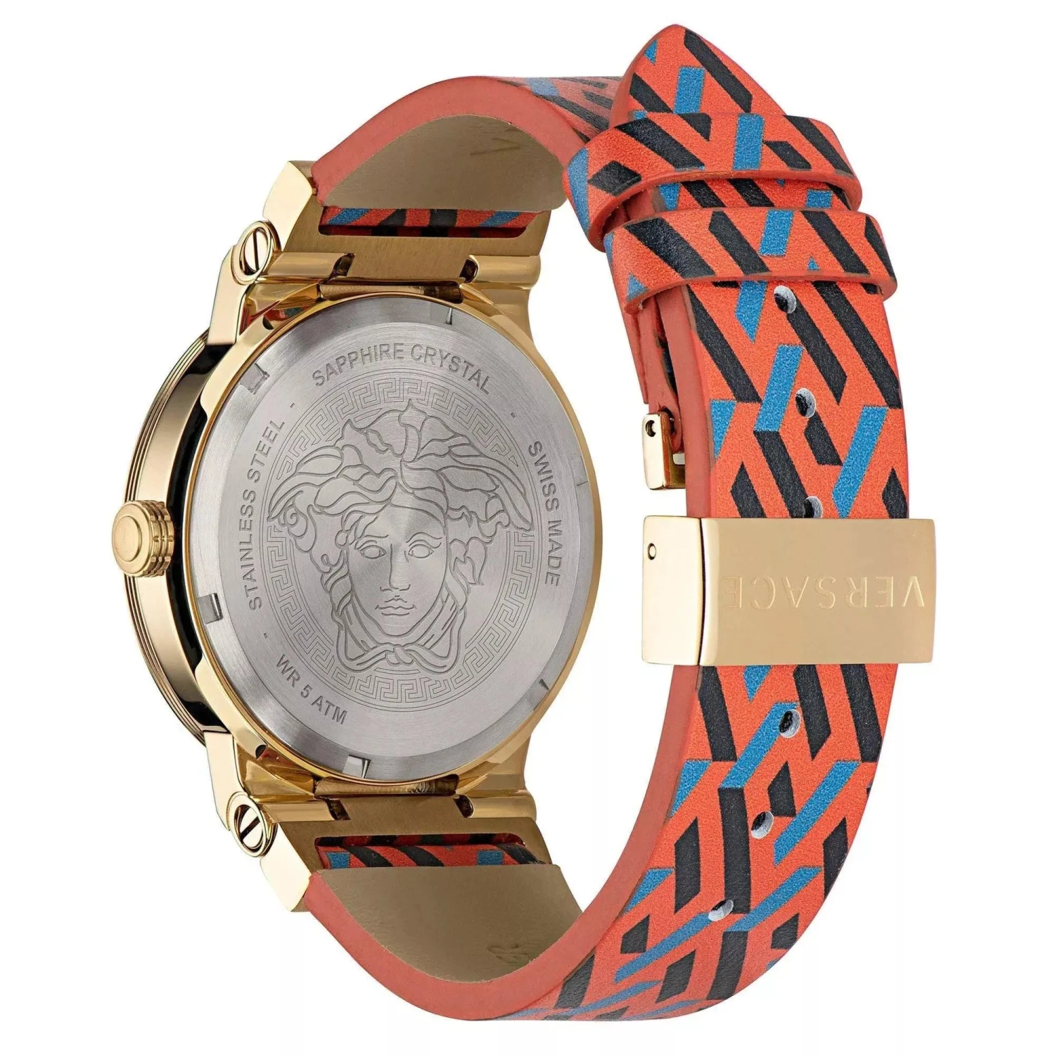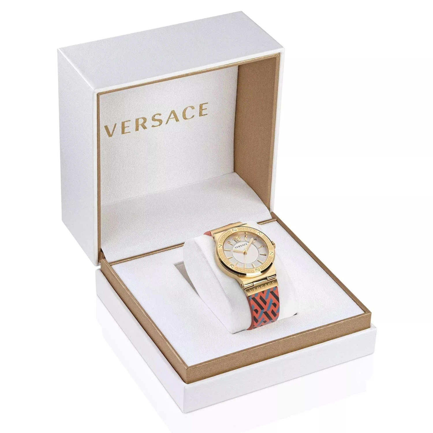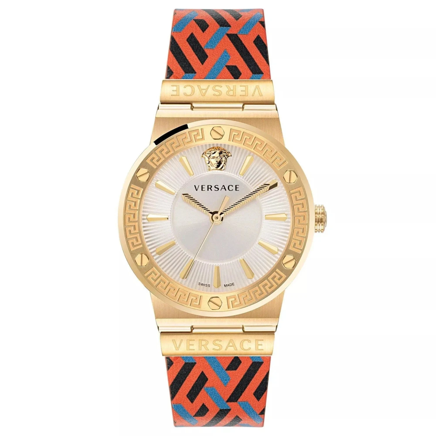 Case: 38mm x 9mm Brushed/Polished 316L Stainless Steel Case – Greca Engraved Bezel with Screw Accents – Solid Stainless Steel Caseback with Versace Engraving. Ant-Reflective Sapphire Crystal Glass. Push-Pull Crown.