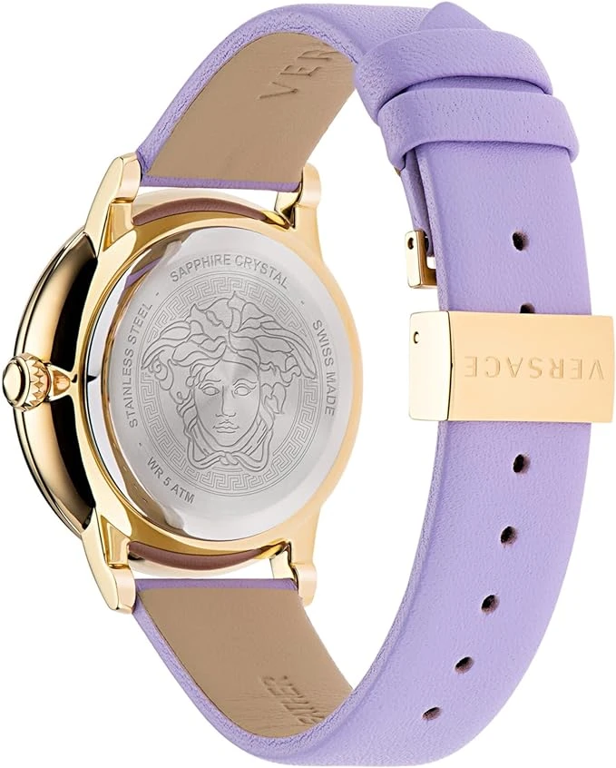 Dial: Lilac Dial – Gold 316L Stainless Steel Hour and Minute Hands – Lilac Versace Medusa Head on Dial – Roman Numeral Hour Indexes.