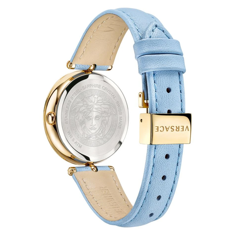 Case: 34mm Polished Gold Plated 316L Stainless Steel Case with Versace Pattern Engraved Bezel – Solid 316L Stainless Steel Caseback with Medusa Head Engraving – Anti-Reflective Sapphire Crystal Glass – Push-Pull Crown.