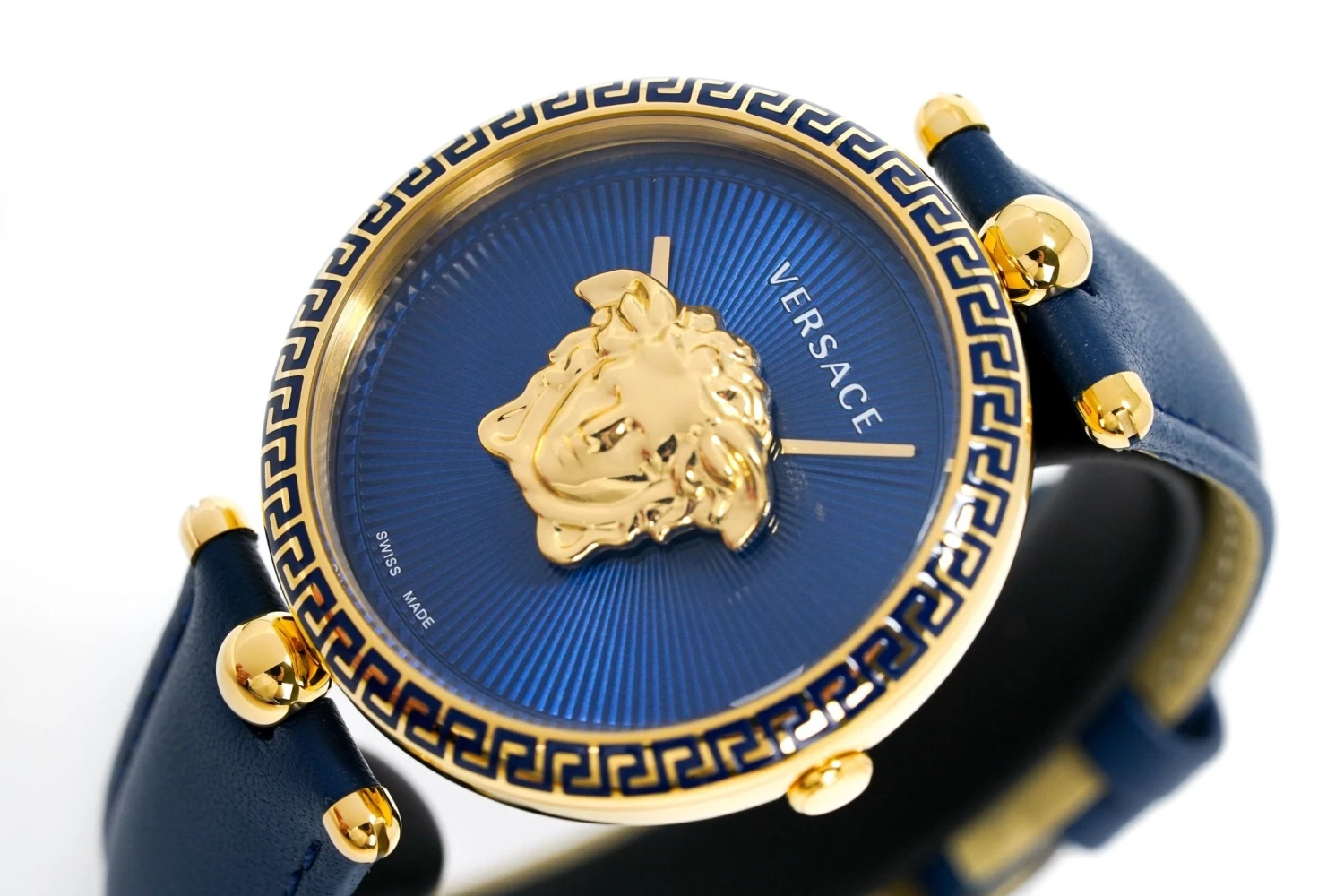 Case: 39mm x 12mm Polished Gold PVD 316L Stainless Steel Case with Versace Shape Blue Enamel Bezel – Solid 316L Stainless Steel Caseback with Medusa Head Engraving – Anti-Reflective Sapphire Crystal Glass – Push-Pull Crown.
