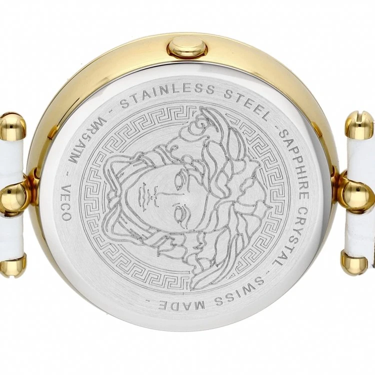 Case: 39mm x 12mm Polished Gold Plated 316L Stainless Steel Case with Versace Pattern Engraved Bezel – Solid 316L Stainless Steel Caseback with Medusa Head Engraving – Anti-Reflective Sapphire Crystal Glass – Push-Pull Crown.
