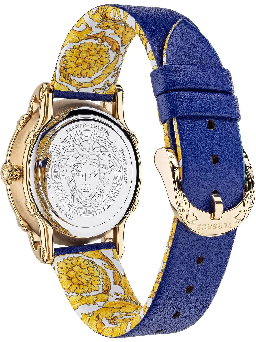 Case: 34mm x 10mm Gold Plated 316L Stainless Steel Case – Anti-Scratch Sapphire Crystal – Push/Pull Crown – Solid Caseback with Medusa Head Engraving.
