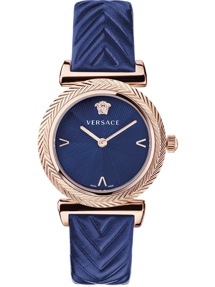 Dial: Blue Guilloché Dial – Rose Gold Plated Stainless Steel Hour and Minute Hands – Versace Medusa Logo at 12 O’Clock – Hour Indexes.