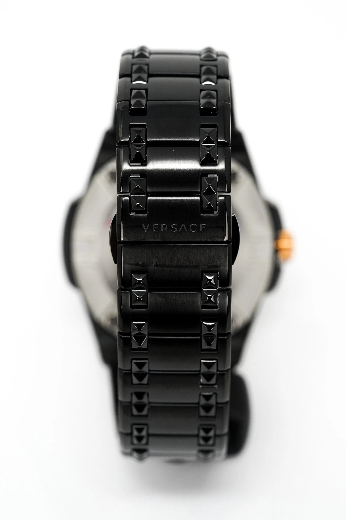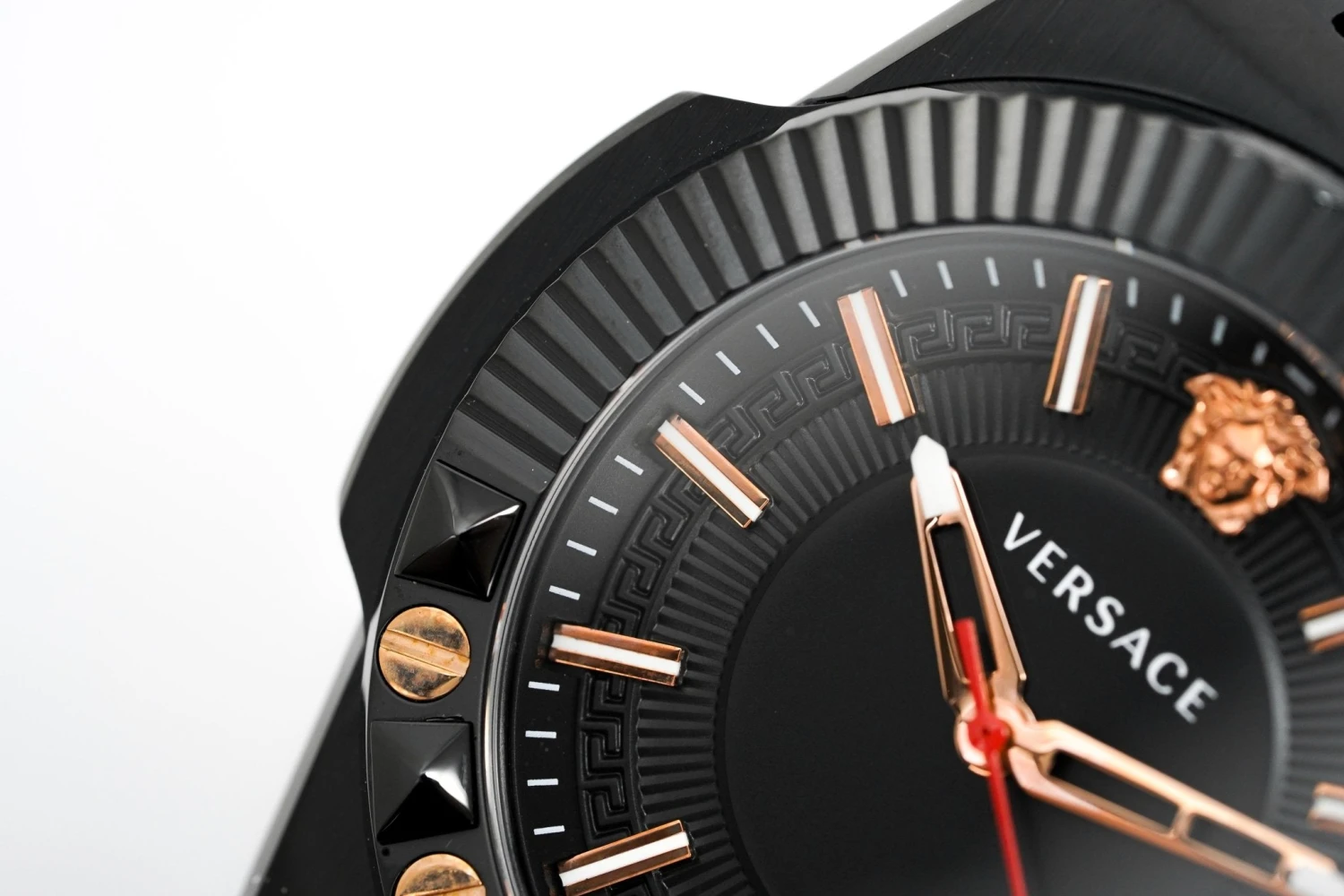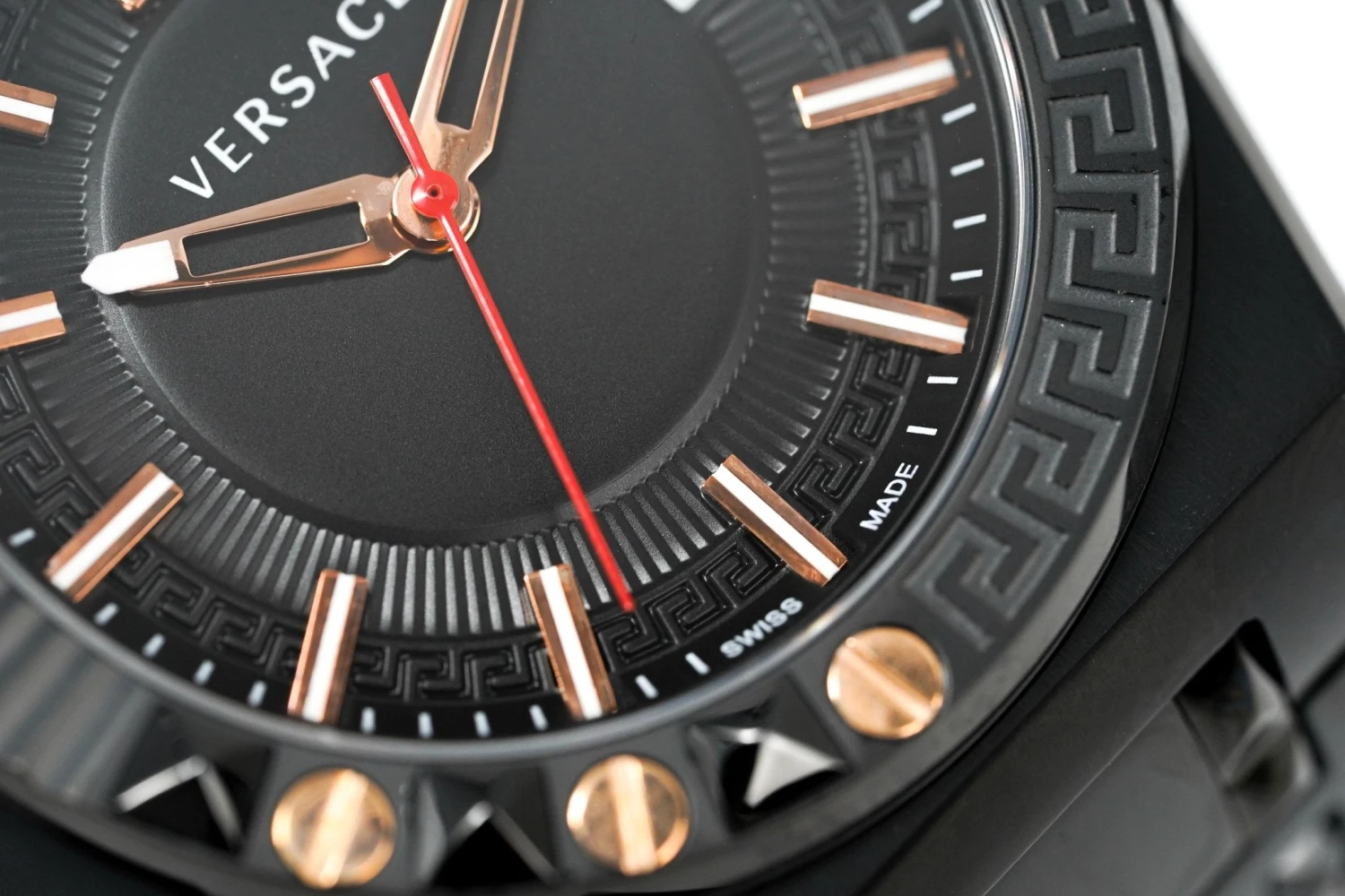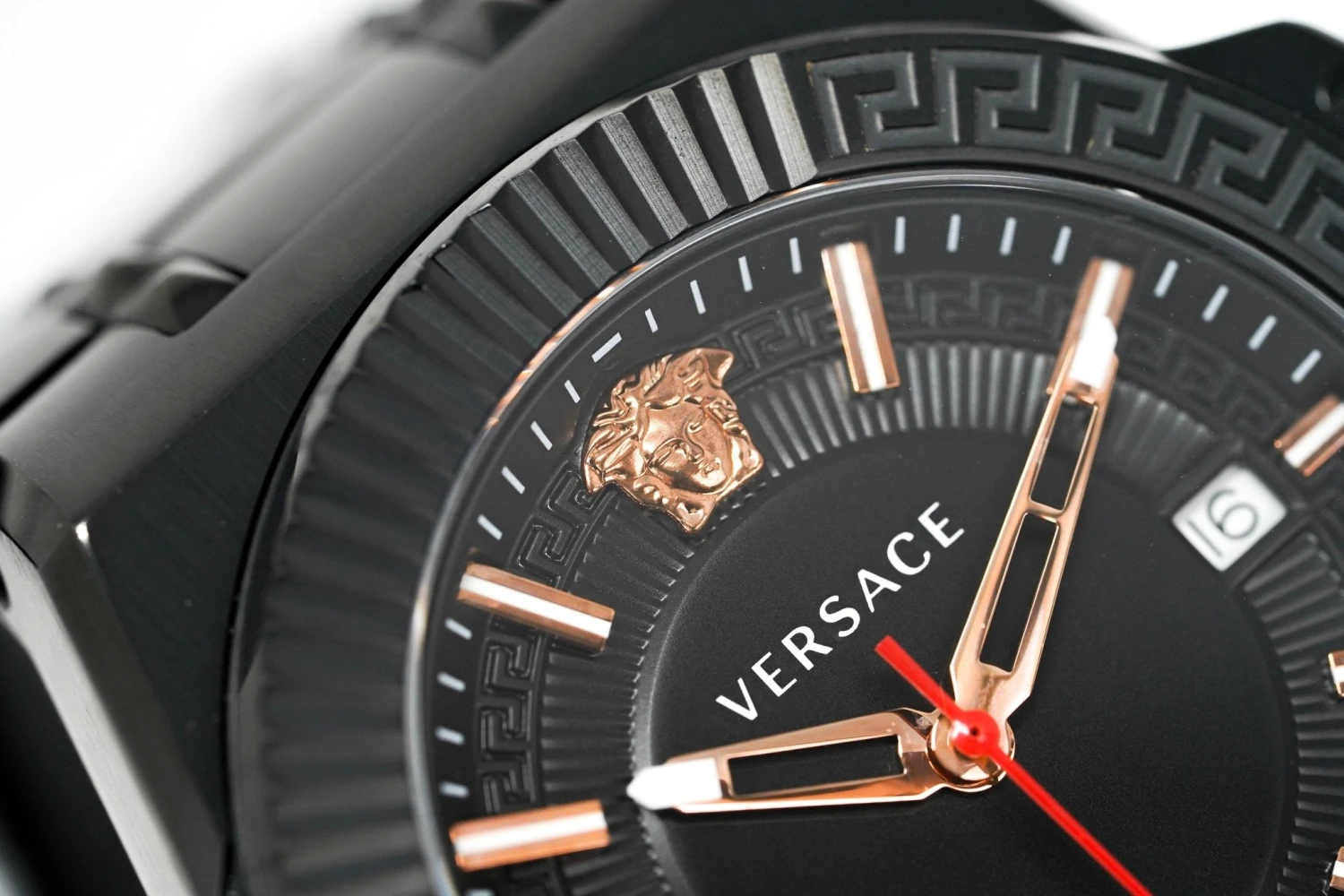 Dial: Black Dial with Greca Pattern Around the Outside – IP Rose Gold 316L Stainless Steel Hour/ Minute Skeleton Hands and a Red Seconds Hand – Date Window at 3 O’Clock – IP Rose Gold 316L Stainless Steel Medusa Head at 12 O’Clock.