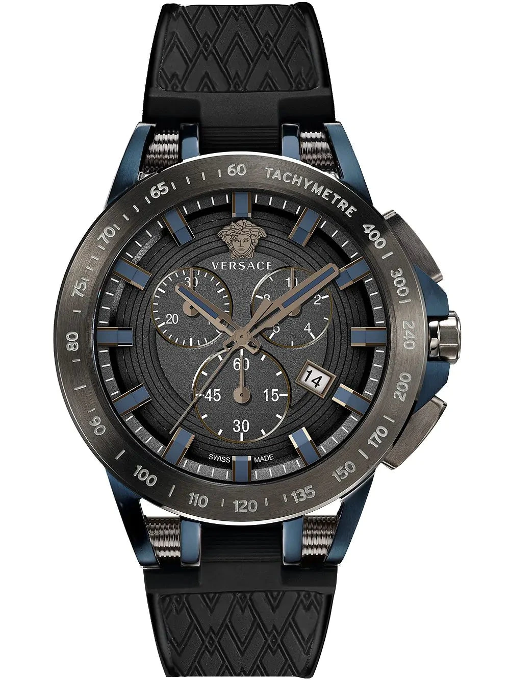 Dial: Black Dial – Black Plated Hour Markers – Black/Blue Hour, and Minute Hands – Date Window at 4 O’Clock – IP Black Medusa Head at 12 O’Clock.