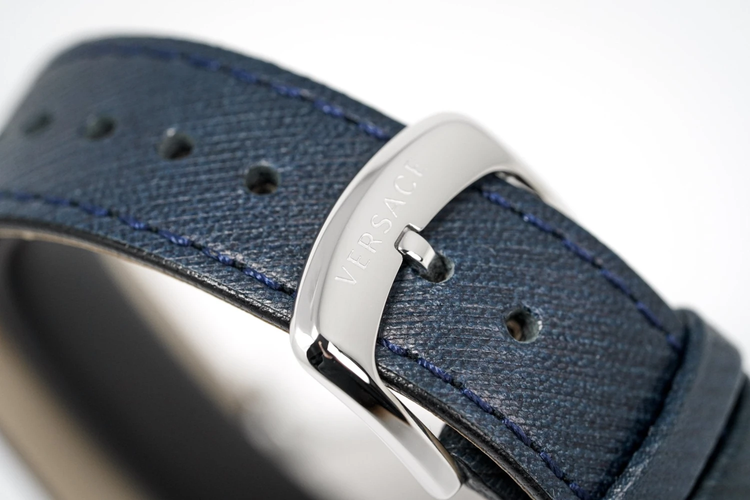 Strap / Bracelet: 20mm Lug Width Blue Leather Strap with 316L Stainless Steel Pin Buckle.