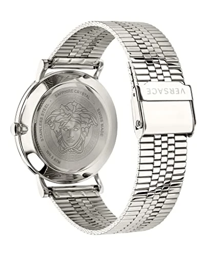 Case: 40mm x 12mm Polished 316L Stainless Steel Case – Solid Stainless Steel Caseback with Versace Engraving – Anti-Reflective Sapphire Crystal Glass – Push-Pull Crown.