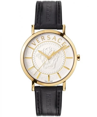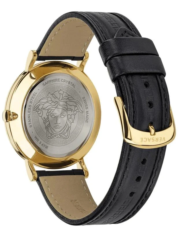 Case: 40mm x 12mm Polished Gold Plated 316L Stainless Steel Case – Solid Stainless Steel Caseback with Versace Engraving – Anti-Reflective Sapphire Crystal Glass – Push-Pull Crown.