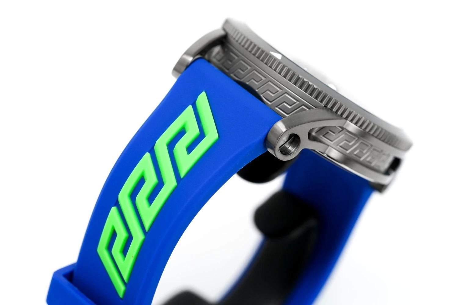 Strap / Bracelet: 20/17.5mm x 17cm Blue and Green Silicone Strap – Gun Metal PVD 316L Stainless Steel Folding Clasp.