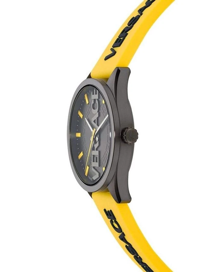 Dial: Black Dial with Greca Pattern – Yellow Stainless Steel Markers – Vertical Versace Logo –Sapphire Crystal Glass.
