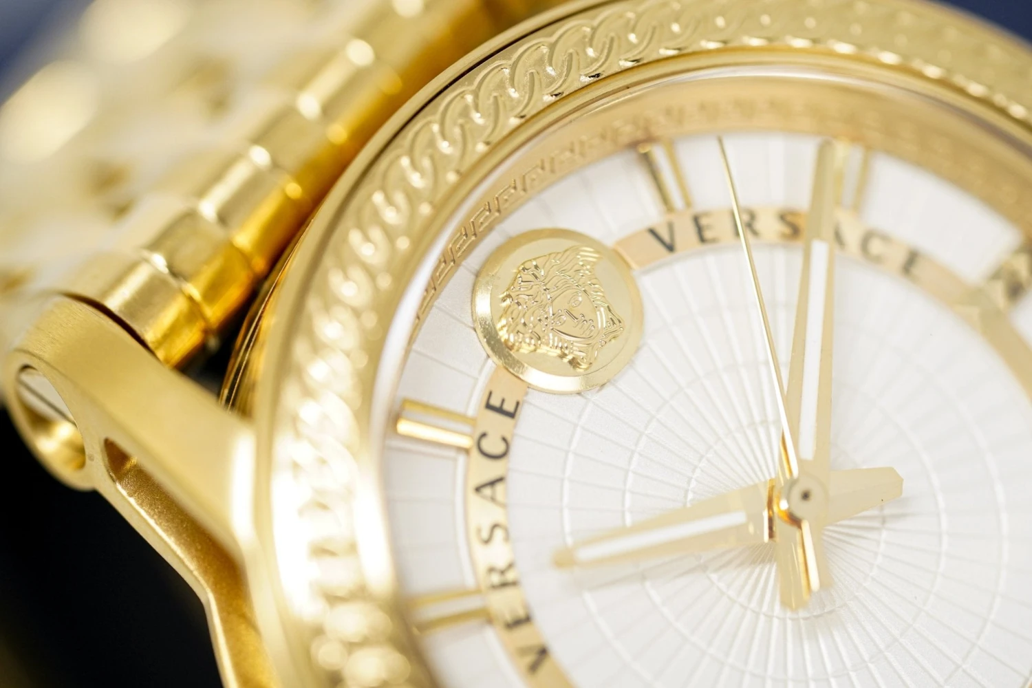 White Dial with Stainless Steel Gold Plate Hour, Minute, and Seconds Hand. Medusa Head at 12.