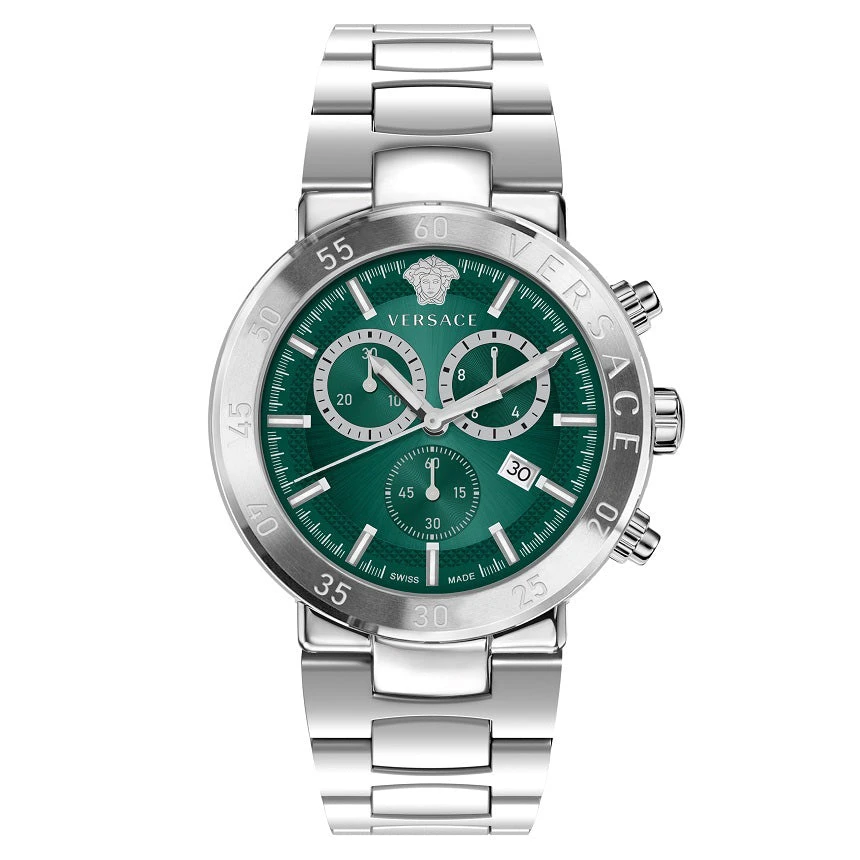 The rich green dial features chronograph sub-dials and a convenient date window, blending functionality with Versace’s signature style. Protected by a durable sapphire crystal, the dial is designed to maintain clarity and resist scratches. Powered by a Swiss quartz movement, this watch guarantees reliable and precise timekeeping.